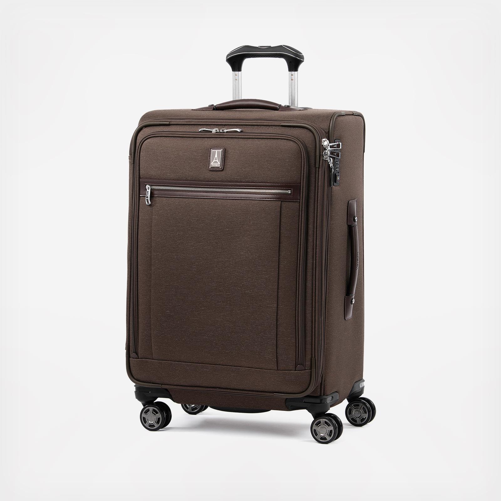 This great-looking, functional and durable Platinum® Elite 25” Expandable Spinner is ideal for medium and long trips and includes all the amenities you need, like a built-in suiter that helps guard against wrinkles and a deluxe tie-down system with integrated accessory pockets that keeps all your items well organized and securely stowed. Crafted with premium fabrics, leather accents and chrome zippers, this handsome bag also includes a tip-resistant tapered expansion feature that provides up to 2 inches of additional packing space, and an integrated, TSA-compliant lockthat keeps contents secure while allowing inspection authorities to access the suitcase without damaging it. For effortless mobility, this suitcase is also equipped with the PrecisionGlide™ system, comprised of eight MagnaTrac® self-aligning 360° spinner wheels, and an adjustable PowerScope extension handle with a patented, ergonomically-designed rubberized Contour Grip for easy handling. Backed by Travelpro’s Built for a Lifetime Limited Worry-Free Warranty
