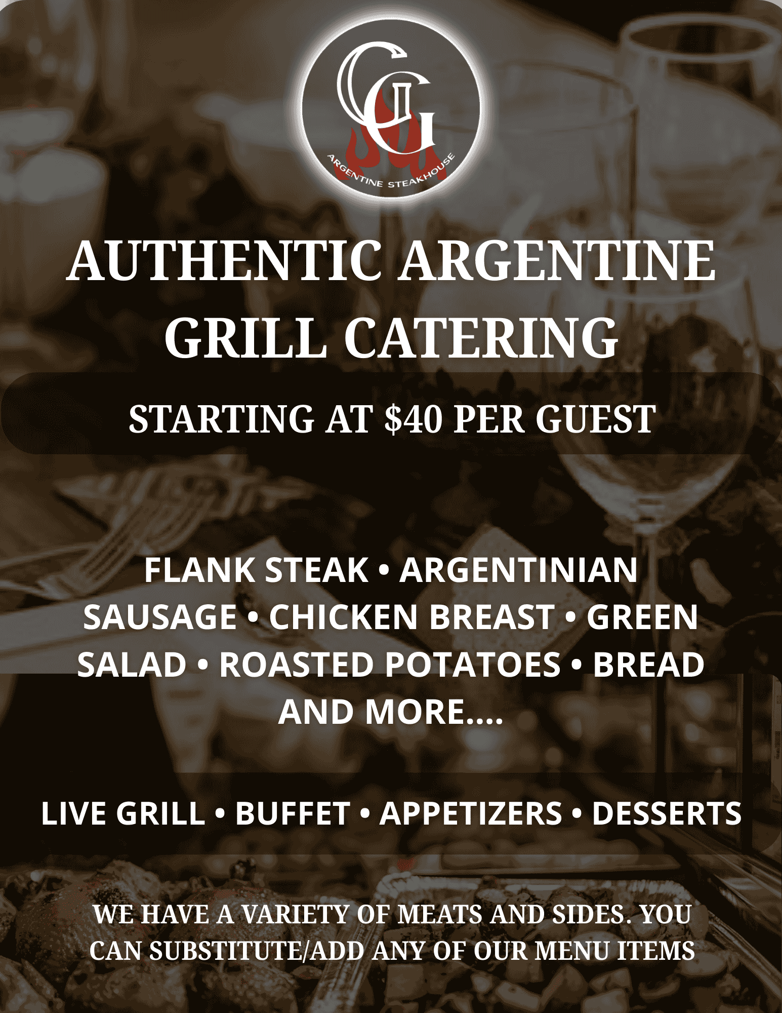 Make your event unforgettable with the authentic flavor of Argentina. GG Steakhouse offers live grill, buffet service, appetizers, and desserts. Perfect for weddings, birthdays, corporate events and more.