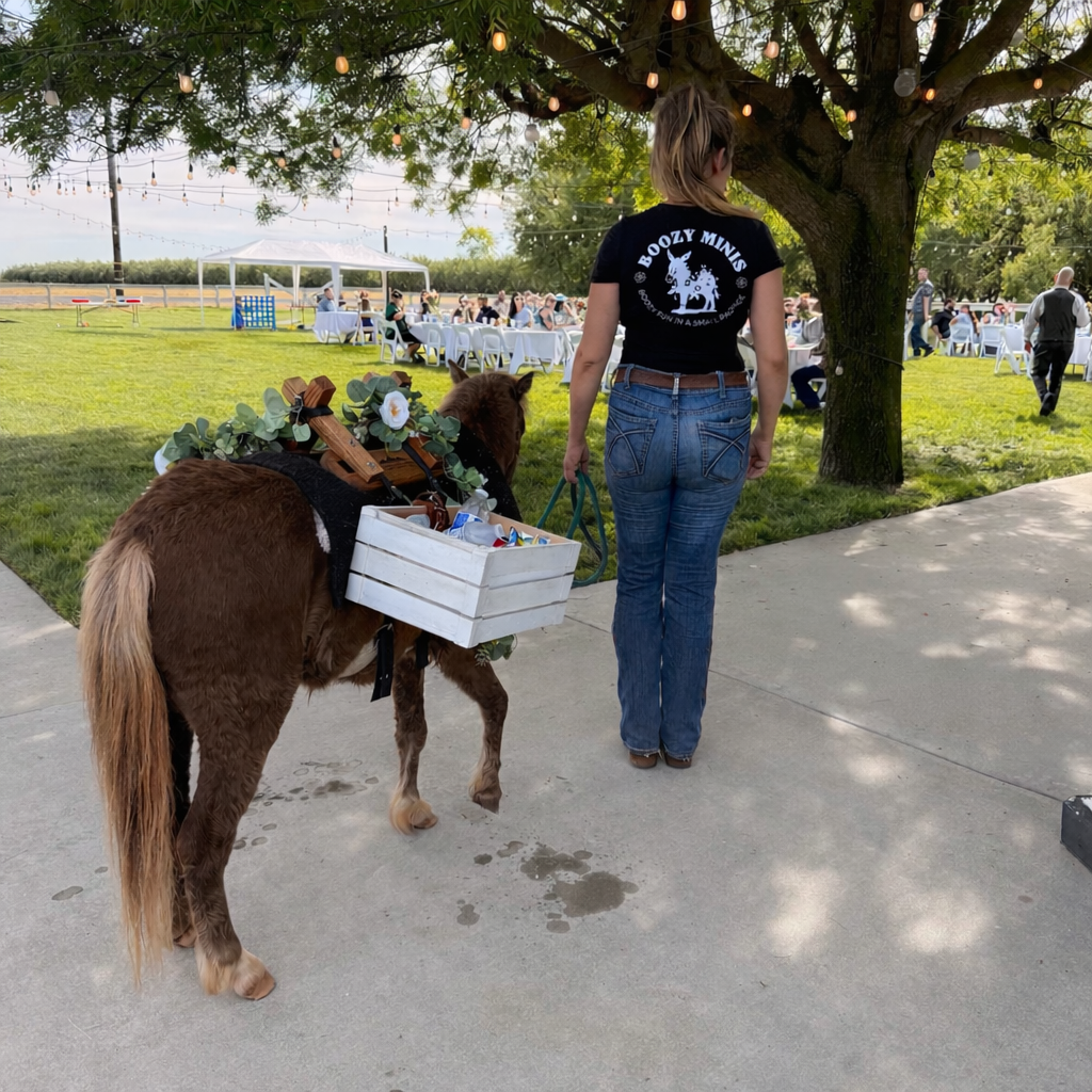 Double the charm and double the fun with two Boozy Minis. This package includes 1 hour of beverage display service featuring our mini burro and horse, Luke and Lucky. Perfect for cocktail hour, guest welcome, and unforgettable photo moments, this experience creates a unique and interactive touch your guests will love and remember. You provide the drinks—we’ll create the kind of experience your guests won’t stop talking about. Additional Mini (not carrying drinks) can be added