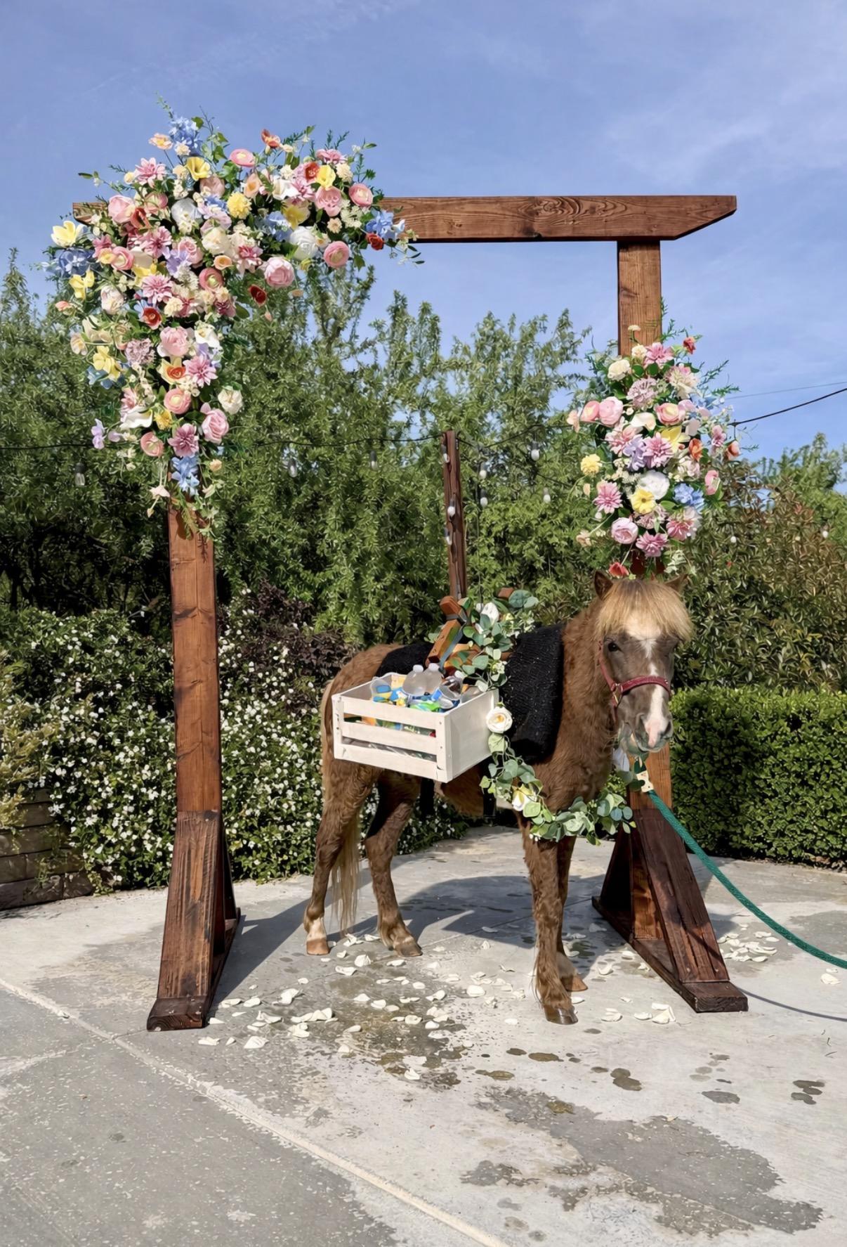Enjoy 1 hour of beverage display service with your choice of Luke (mini burro) or Lucky (mini horse). Includes two beverage baskets, with optional floral styling available. Perfect for cocktail hour, guest greetings, and unforgettable photo moments.You provide the drinks—we’ll create the kind of experience your guests won’t stop talking about. Additional Mini (not carrying drinks) can be added.