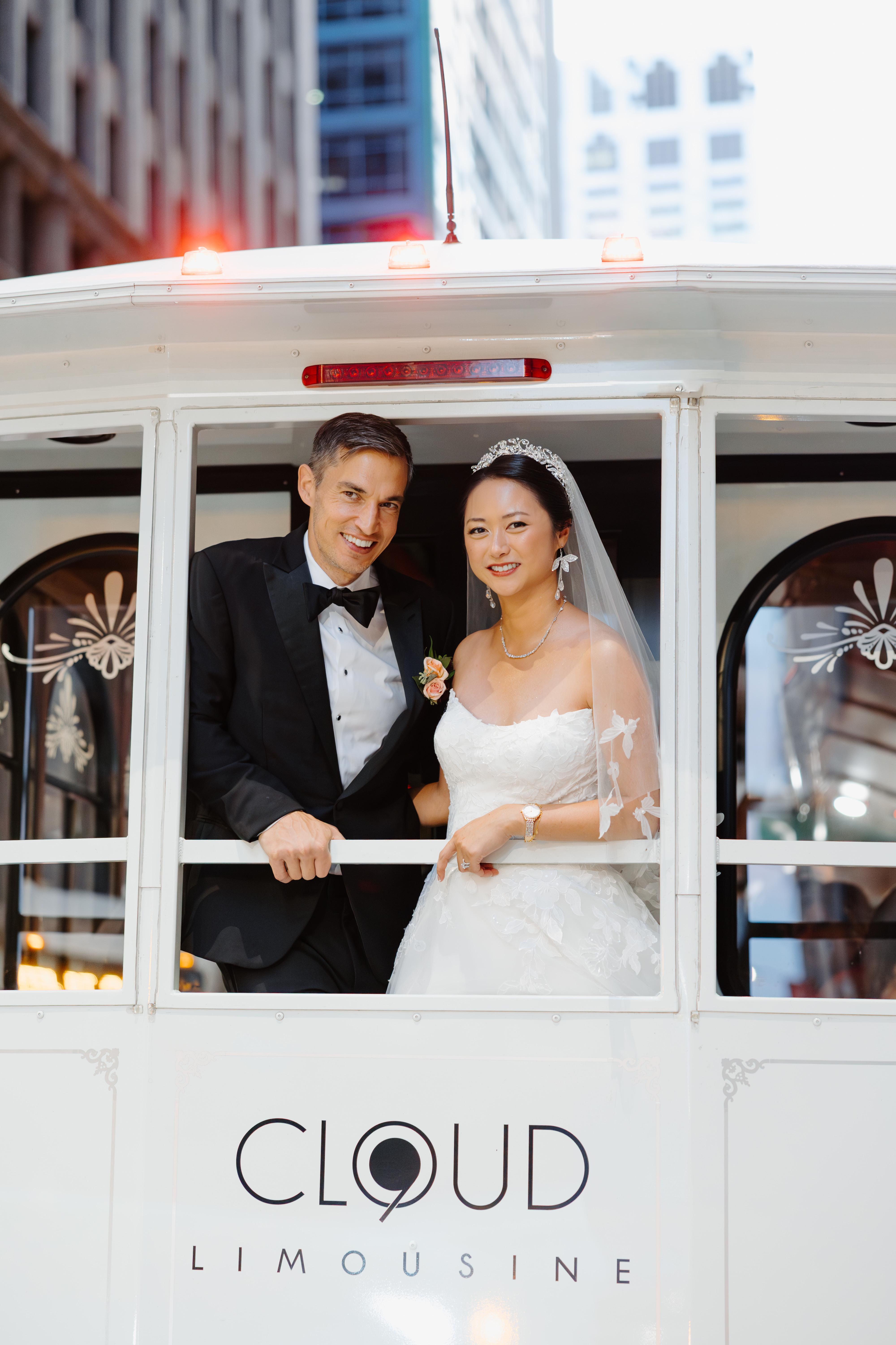 Trolley Wedding Packages start with a 5-hour minimum rental Starting at at $2,000 total; each additional hour if needed +$200. Driver’s tip and all fees are already included. Flexible booking, allowing you to update pickup times and locations closer to your wedding date. All our Trolleys are 2024 models or newer, and can accommodate up to 30 passengers. Some of the features are: AC; Sound system with Bluetooth connectivity; Wrap around style seating; Balcony; Ice Bar.