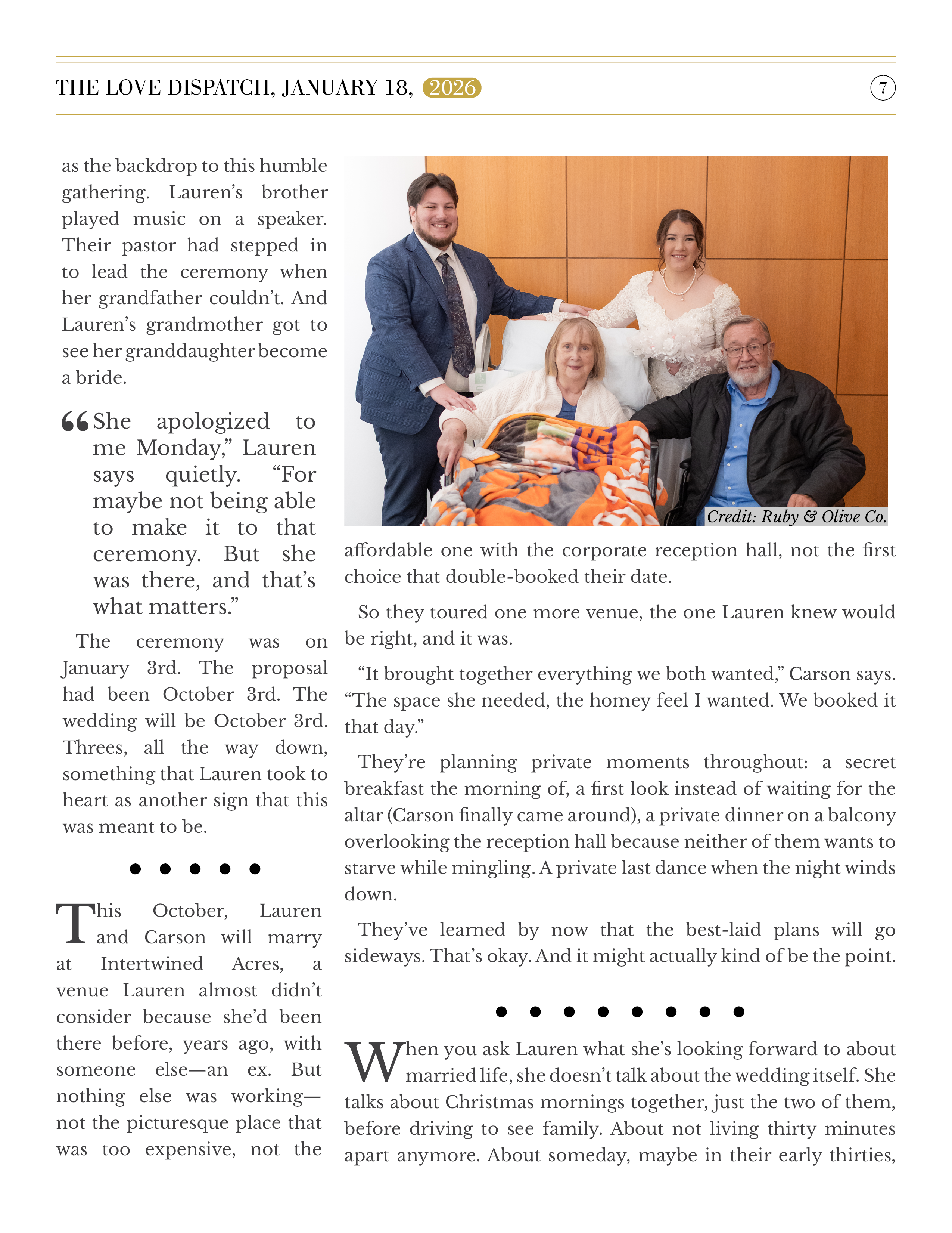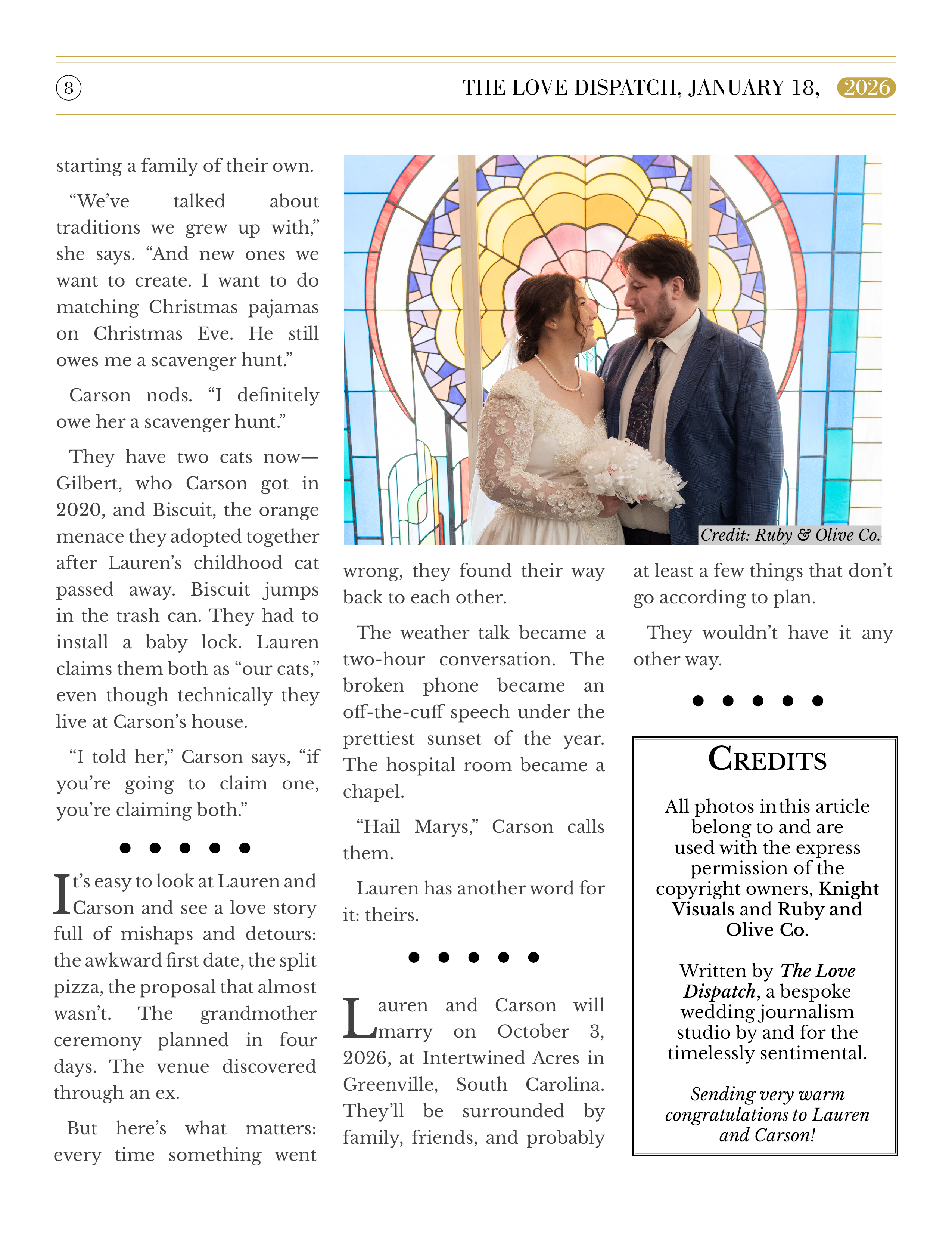 - Written love story feature (2,000–3,000 words)