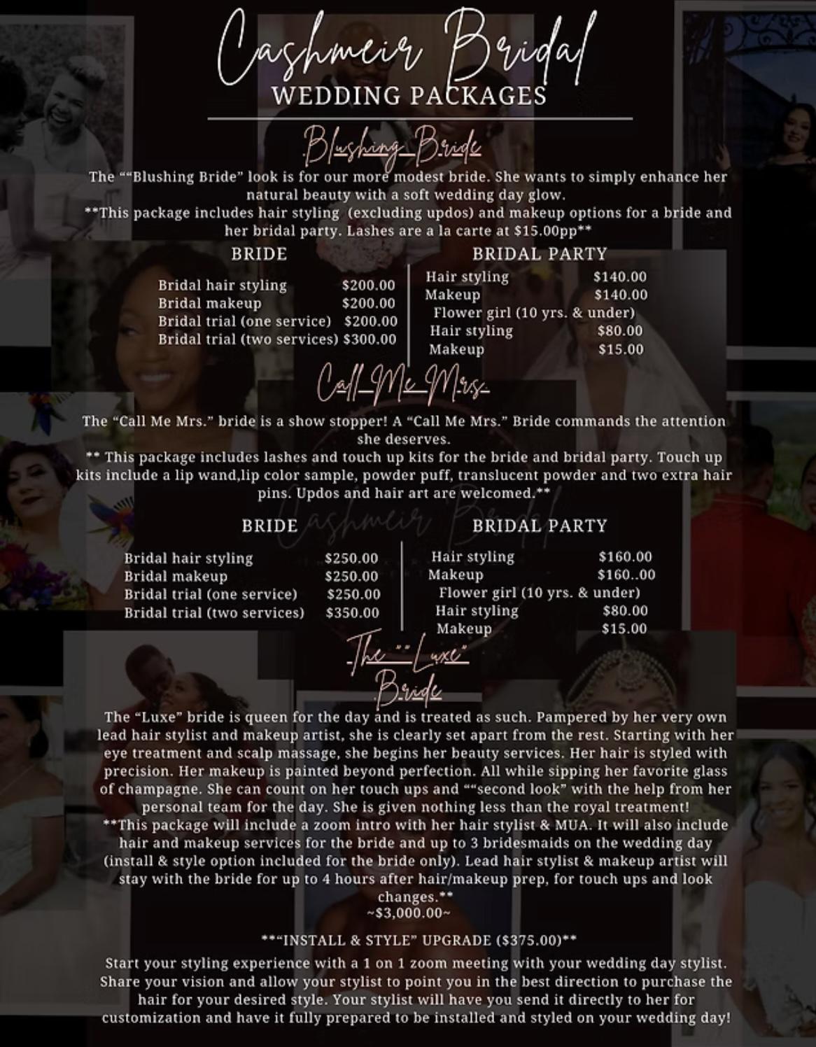 Starting at $200.00 per bridal service, this package includes a simple and natural hair and makeup look.