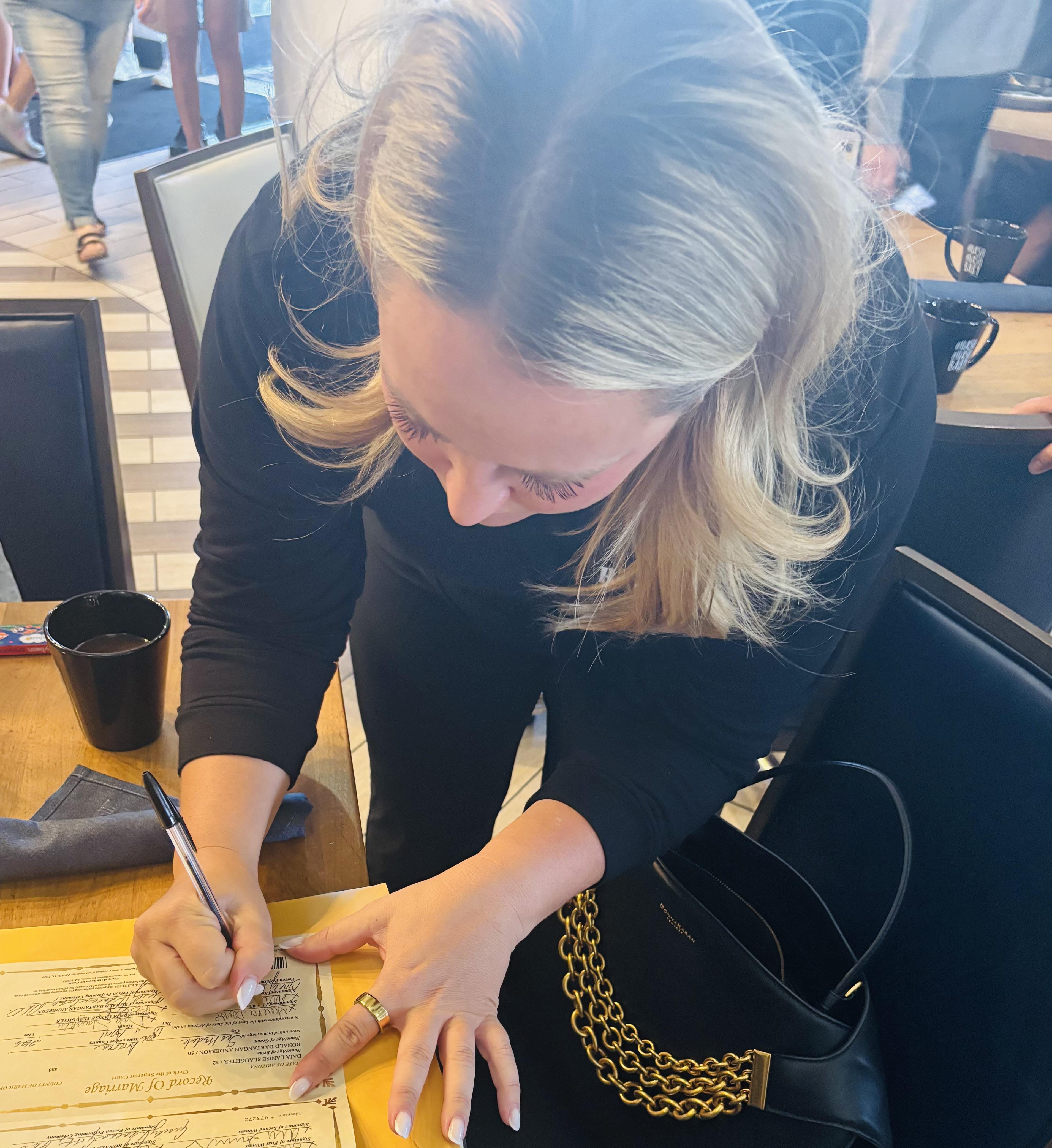 Hitch Happens signs the couple's marriage license. The process is approximately 10 minutes. It does not involve vows or the exchange of rings. This is ideal for couples who do not desire the "frills" associated with a traditional wedding and those who are planning an international destination wedding.