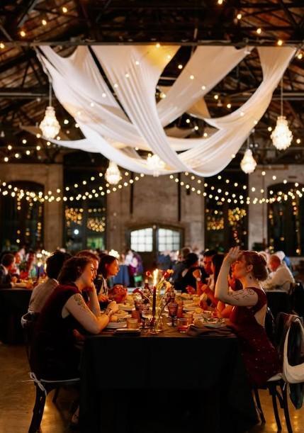 Our large hall has dimmable bistro lighting 29 10 foot farm tables 250 Fruitwood Crossback Chairs and cushions Multiple moveable bars to create the floor plan of your choice