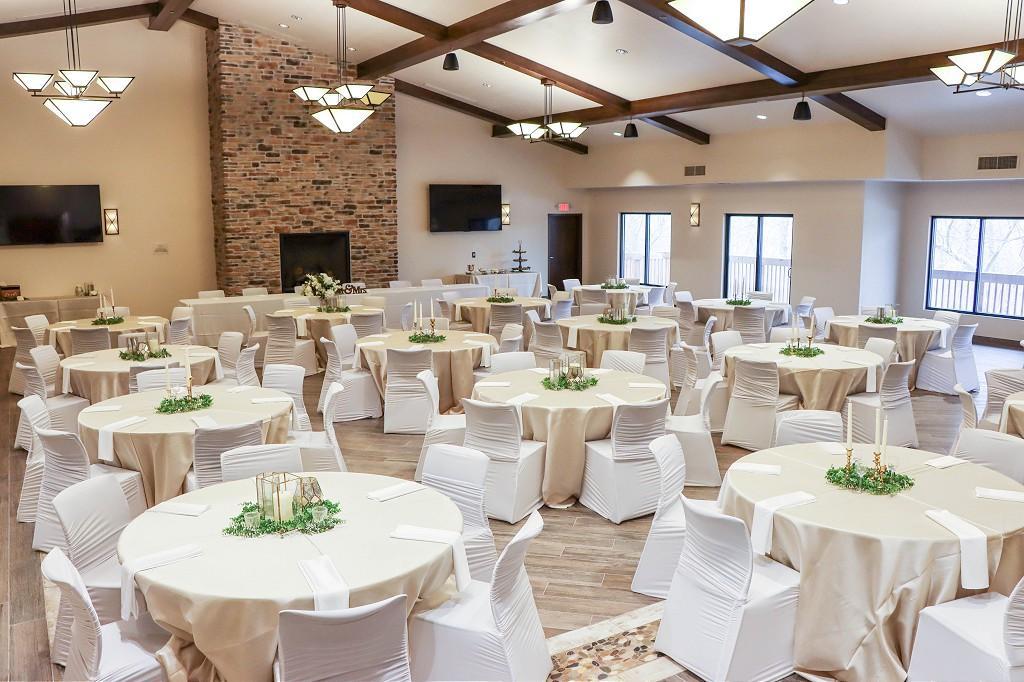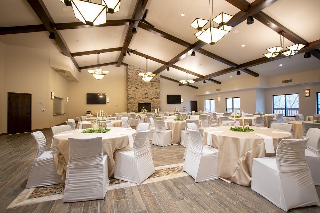The banquet room features vaulted ceilings with natural maple wood beams and a stone to ceiling fireplace. The room can combine with the meeting room to increase capacity.