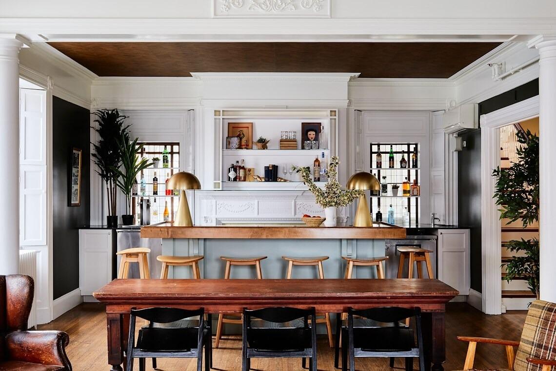 The Carleton Street property is designed for seamless, social celebrations that flow naturally from one room to the next. The Parlour level features a sun-drenched sunporch and a series of fire-warmed living spaces adorned with one-of-a-kind artwork, vintage furnishings, and rich textures. For outdoor moments, the peaceful back garden offers a lush, secluded escape surrounded by historic brickwork. Below, a historic speakeasy-style billiards room provides a spirited, moody backdrop for late-night cocktails. With a full-property buyout, couples enjoy private access to the commercial kitchen and all six uniquely designed guest rooms for an immersive weekend experience.