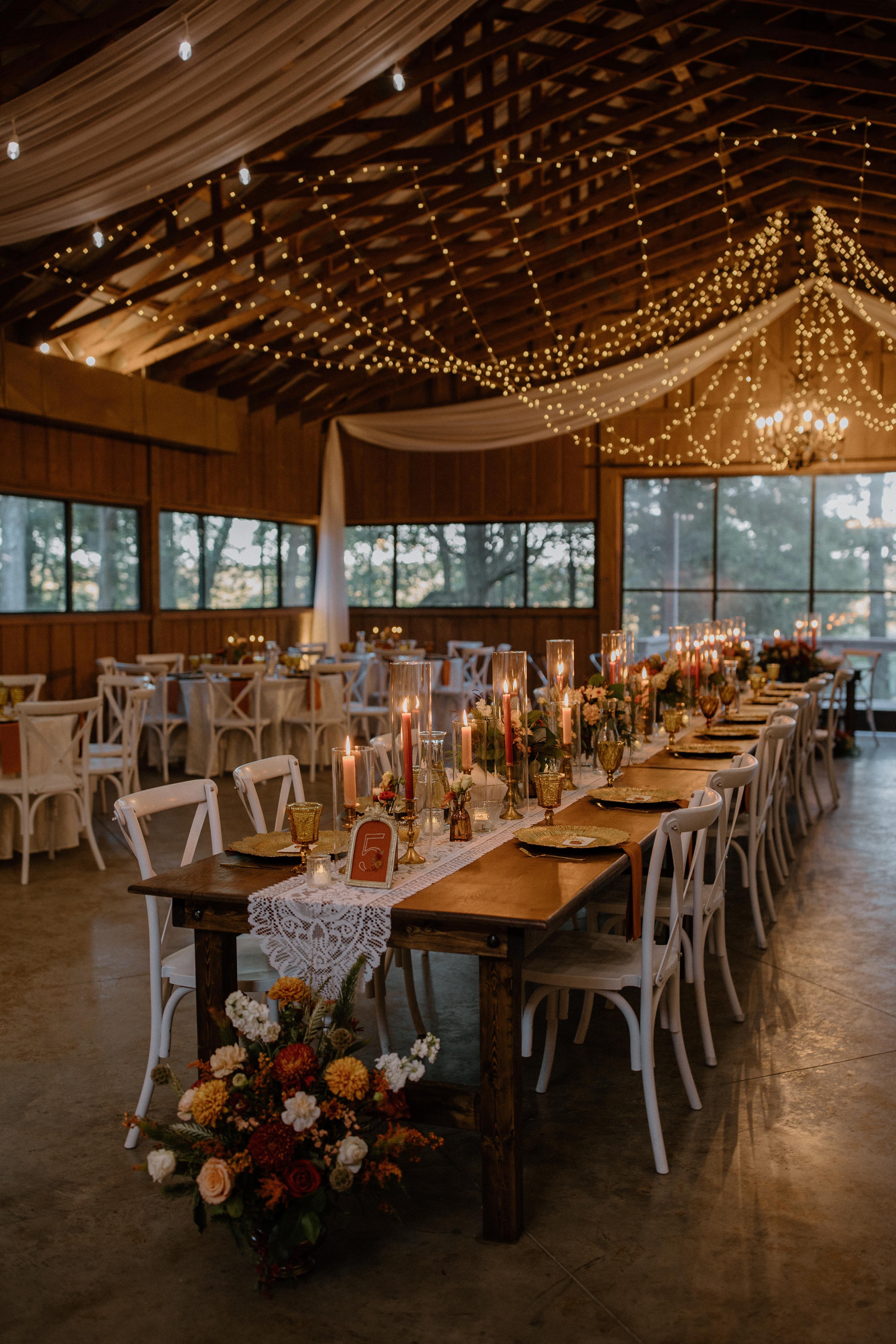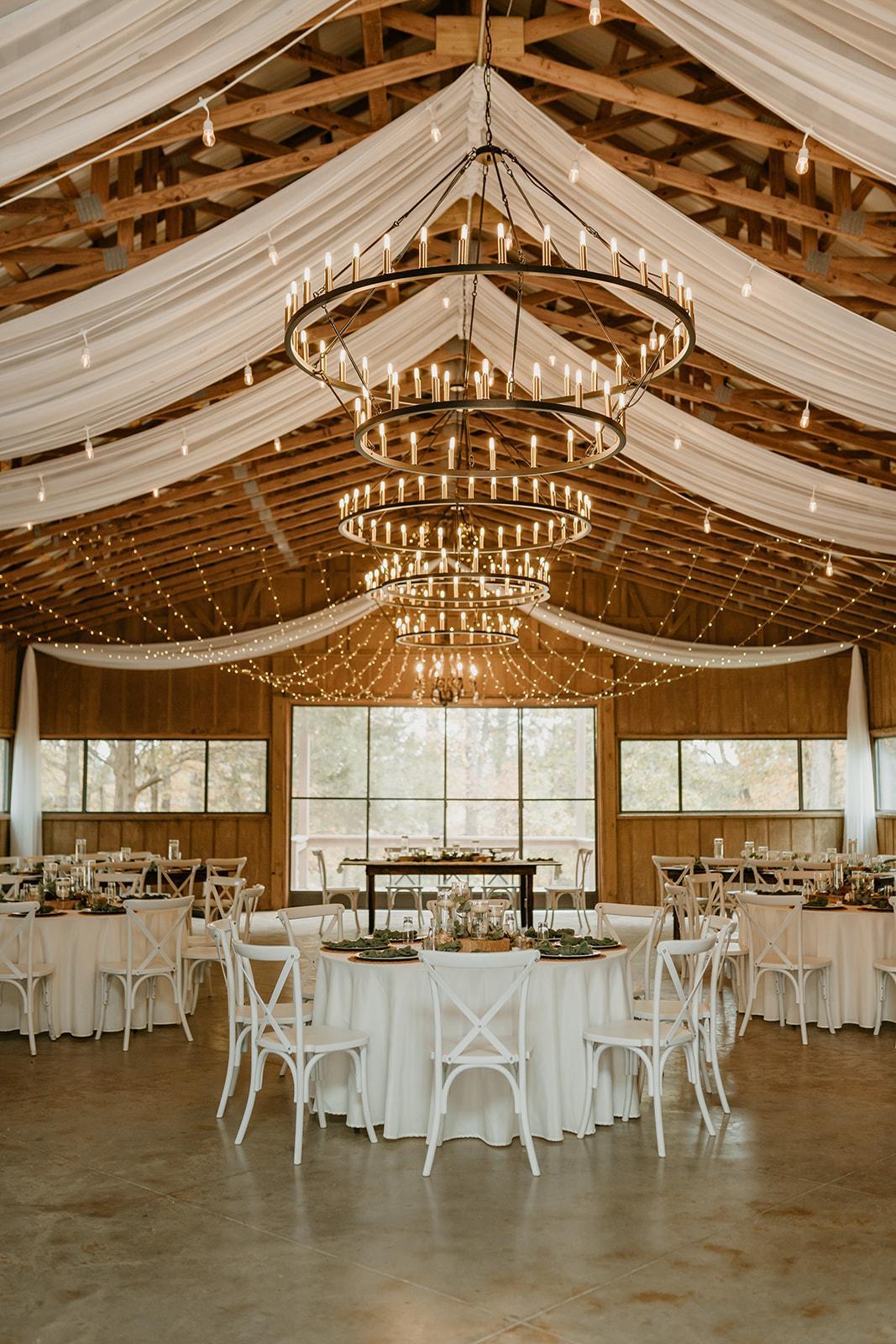 This all-natural wood structure, adorned with twinkling string lights and exposed beams, is nothing short of breathtaking. Fern Hall comfortably hosts up to 160 guests and seamlessly opens to the great outdoors, offering fresh country air or cozy comfort with heating and air conditioning. Our luxury bridal suite features a stunning chandelier and elegant gold-framed mirror.