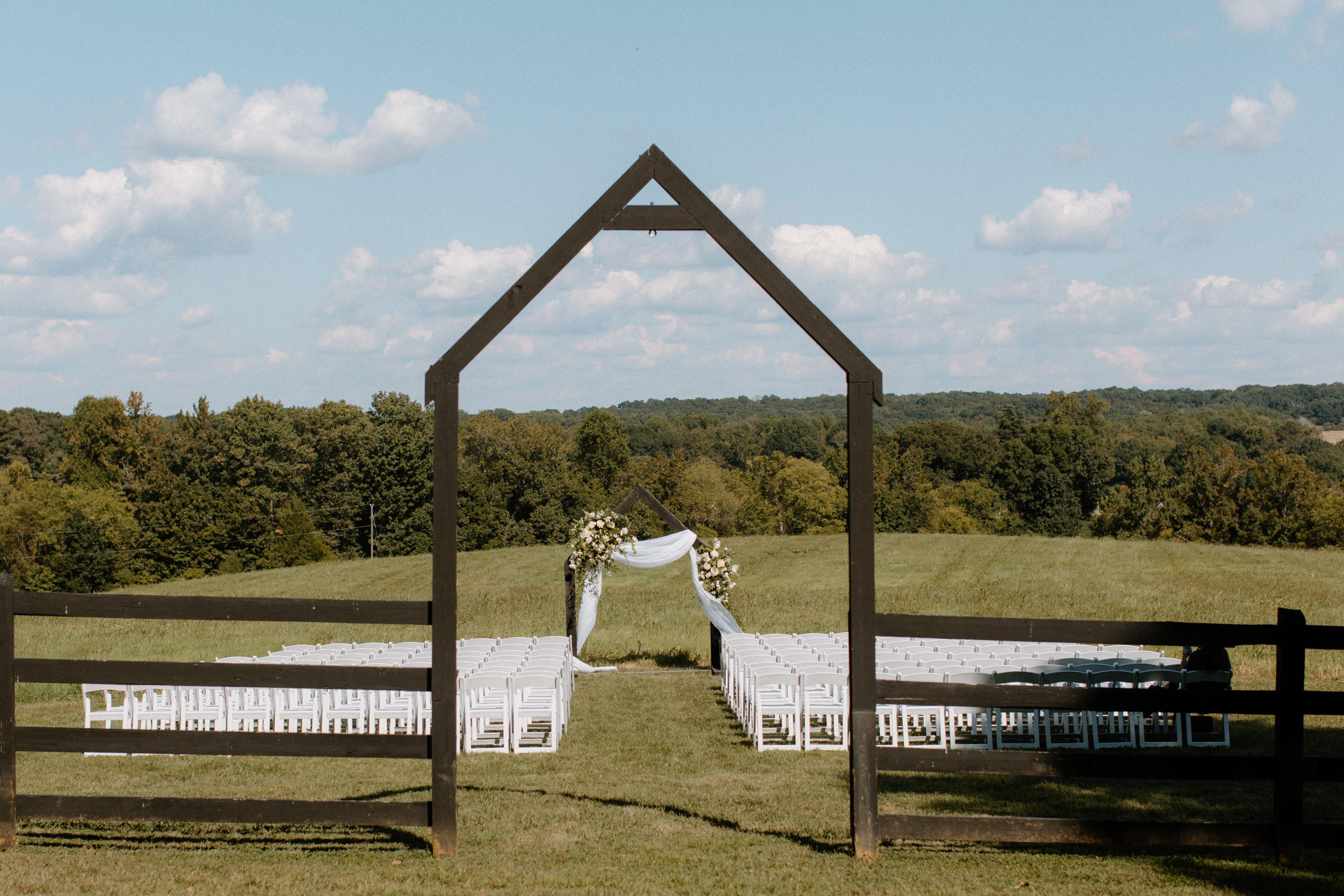 - Beautiful farm fence line backdrop, with acres of rolling hills - 180 White folding chairs with padded seats - Access to our ceremony backdrops including our beautiful wooden hexagon and rustic cross - 6 passenger golf cart and staff member to assist in transporting guests with mobility problems