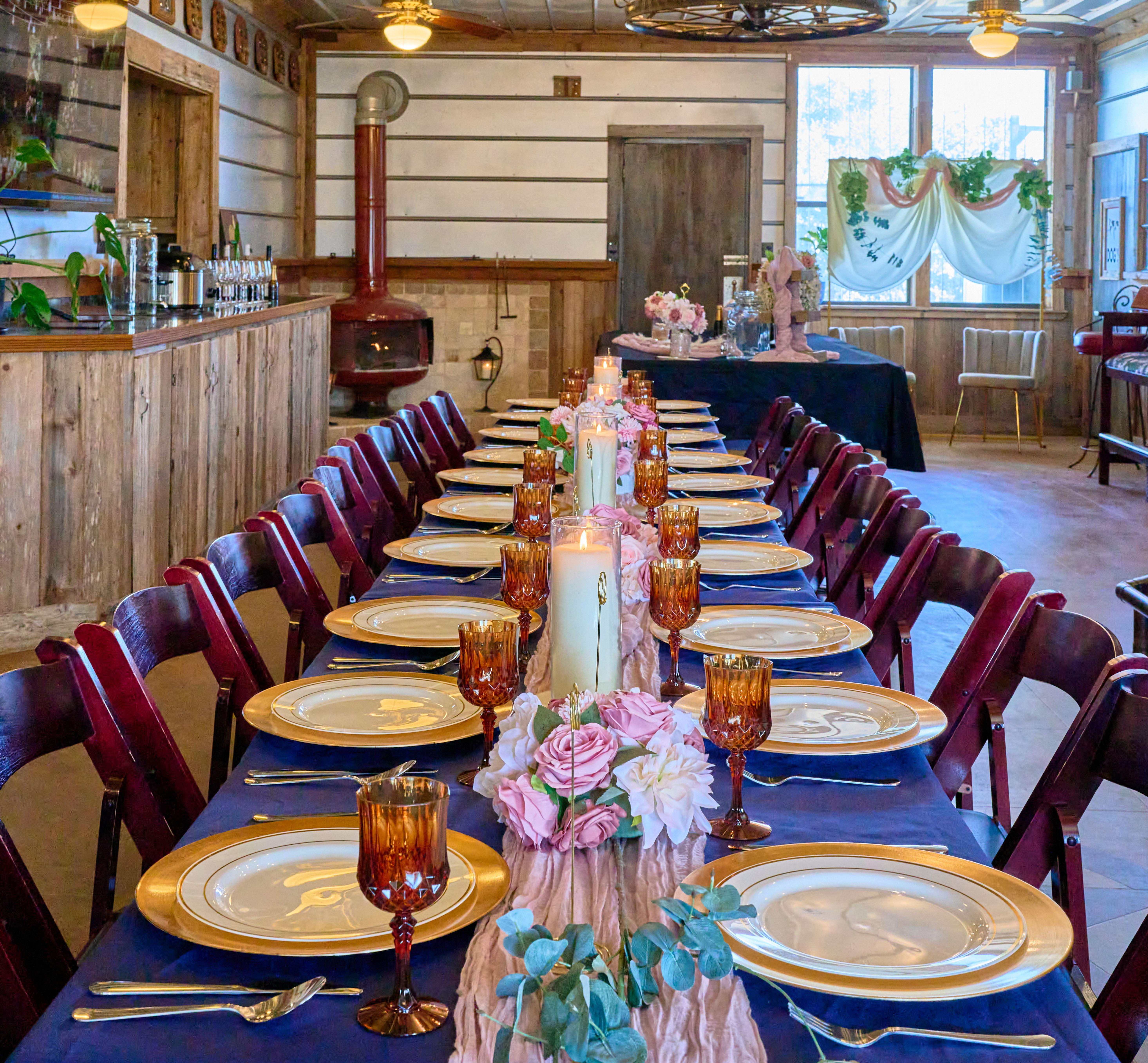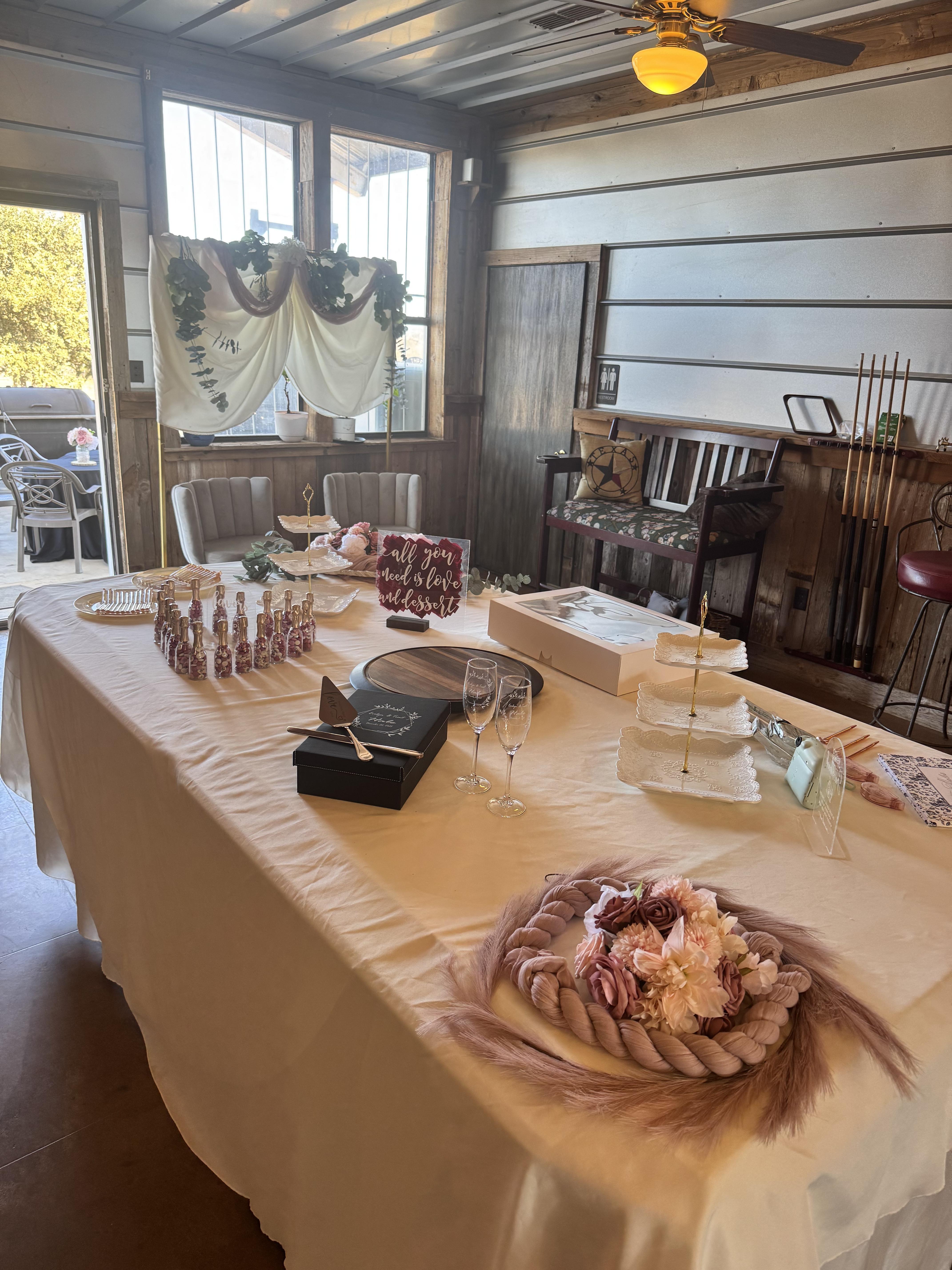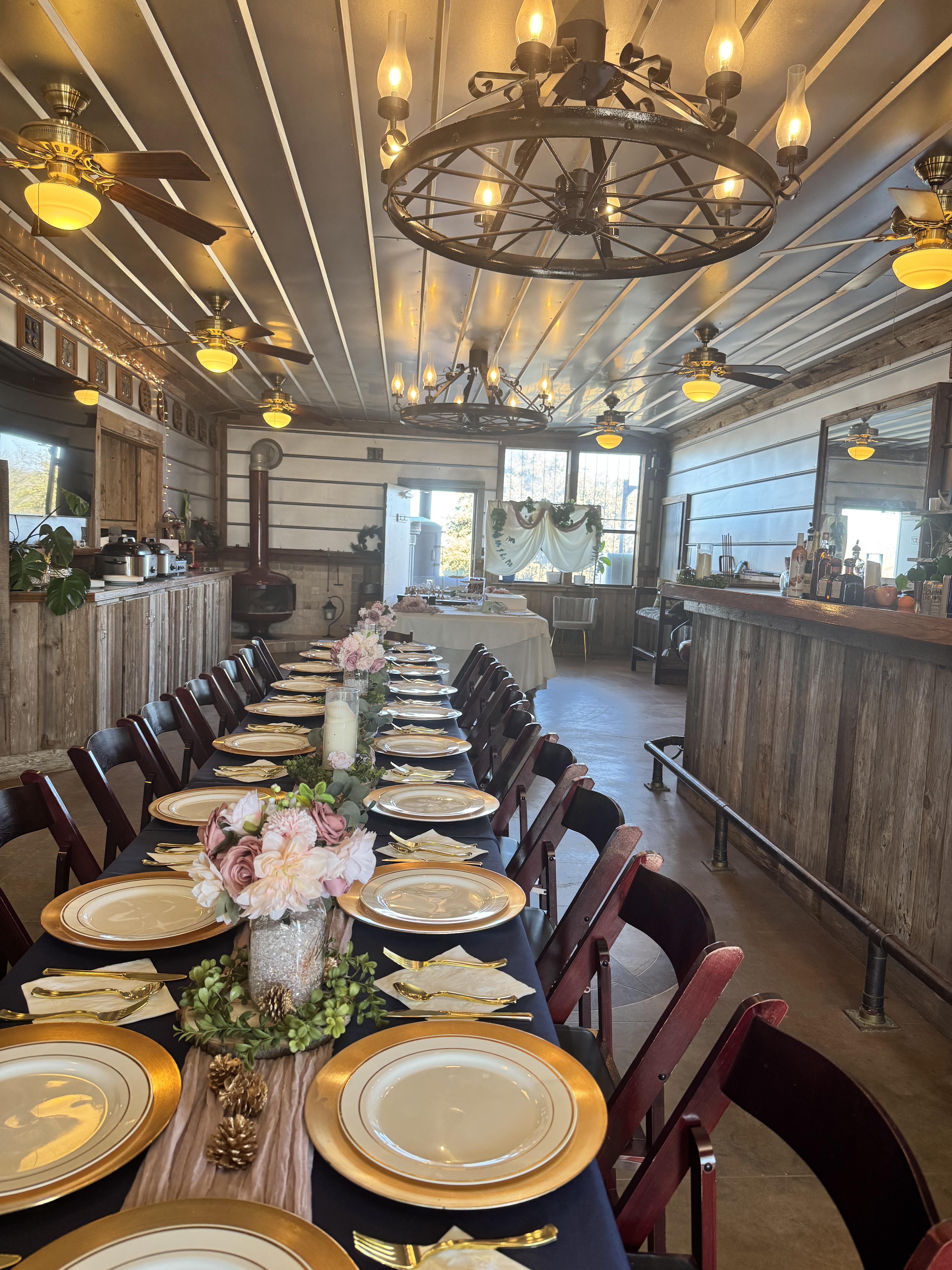 Interior space has: a bar, long tables and chairs, a kitchen. We can decorate. We may have a space for your desserts. Exterior space: adjacent to motorsports club house, access to get-ready room, outdoor pavilion, games, and off-road track.