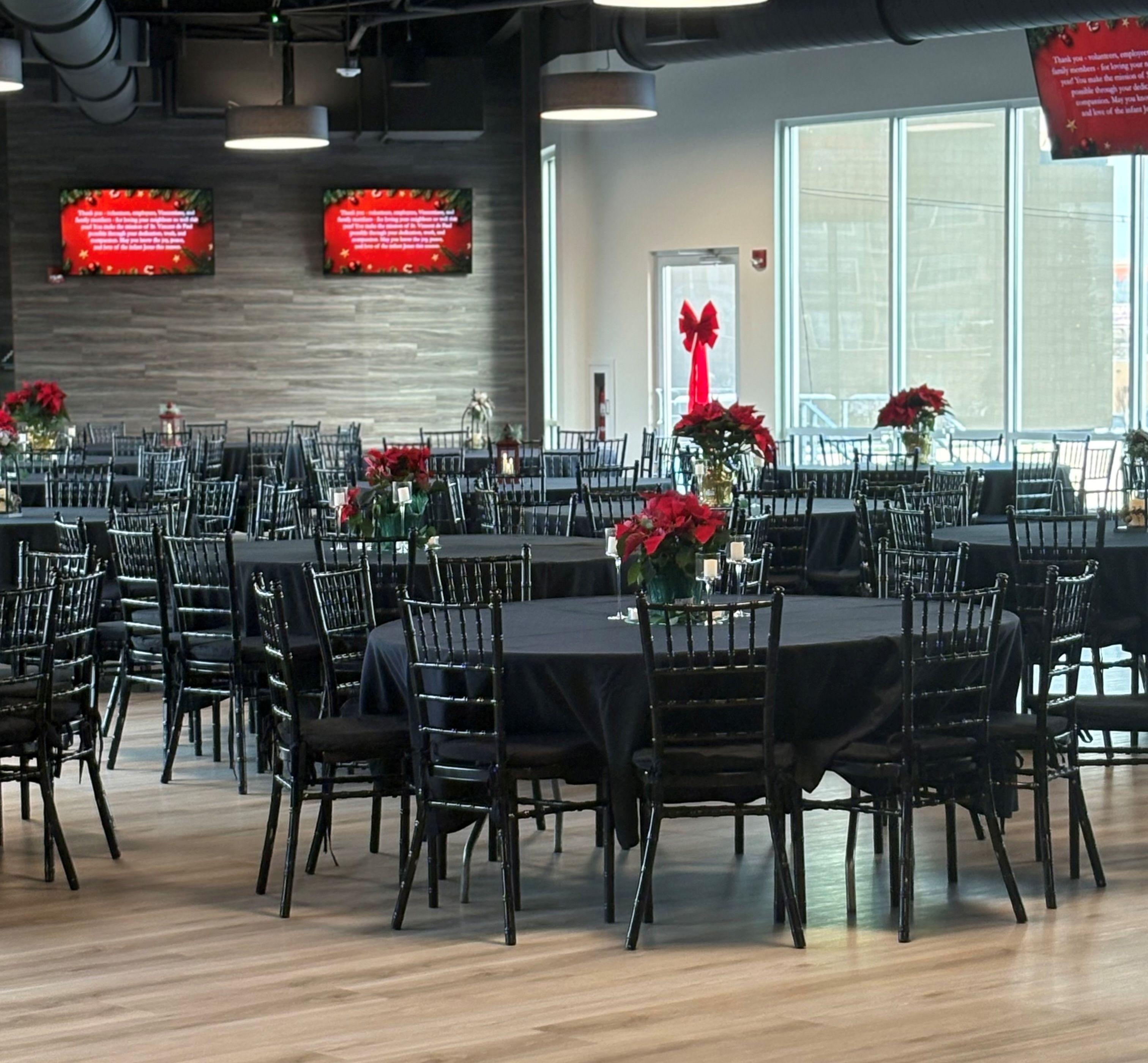 Our venue includes standard round banquet tables and chairs with floor-length black or white linens and matching napkins. Enjoy house flatware, china, and serviceware in a climate-controlled space. We provide basic setup and teardown, a standing podium, a 98" HD TV with HDMI, high-speed Wi-Fi, plus exclusive access to our 7-story videoboard and 360-degree LED displays including outfield and home plate boards.