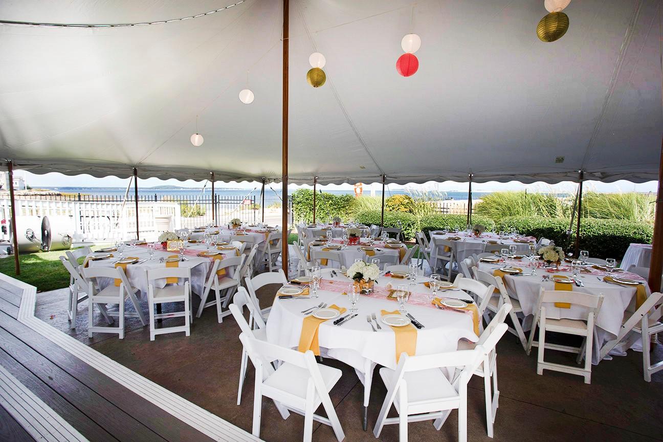 Celebrate under the open sky on the expansive Back Lawn, where the harbor serves as your natural altar. This prime outdoor setting offers a picturesque grassy area leading directly toward the water's edge, ideal for ceremonies or cocktail hours. For the reception, a pristine white event tent provides a sophisticated, weather-protected space that retains the airy feel of the coast. With a dedicated private bar and designated restroom facilities, the lawn transforms into an exclusive seaside estate for your wedding, allowing guests to enjoy the harbor lights and ocean air long after the sun sets over the wharf.