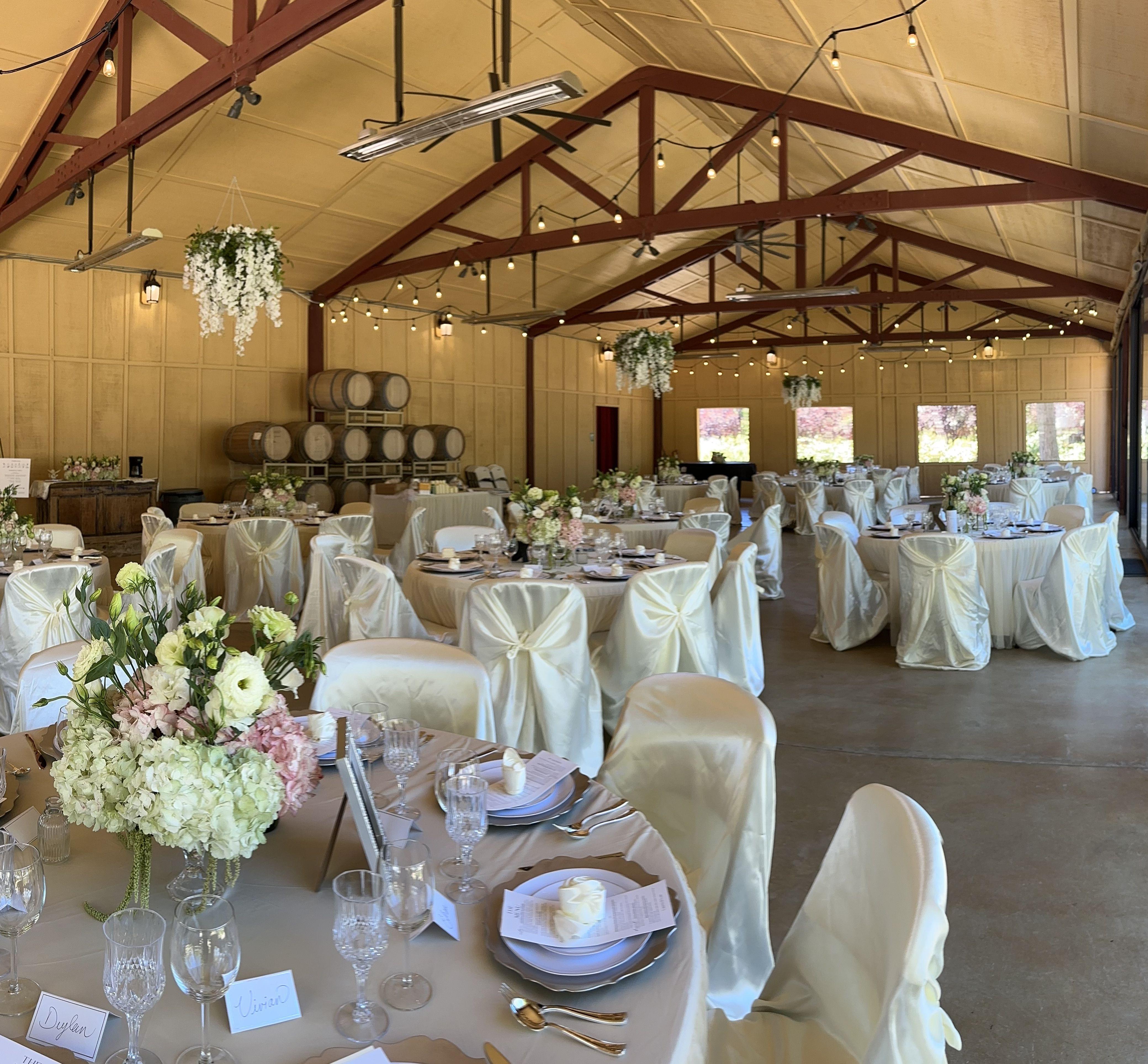 This versatile flagship space is designed to bring the beauty of the outdoors in. Featuring floor-to-ceiling glass sliding walls, the center opens directly onto lush lawns and bistro-lit courtyards, allowing for a customizable atmosphere that adapts to the season. The interior boasts a modern-rustic aesthetic with high ceilings and clean lines, serving as a sophisticated blank canvas for any wedding theme. Whether utilized for a breezy cocktail hour or a high-energy reception, this hall ensures guests are always connected to the stunning vineyard horizon.