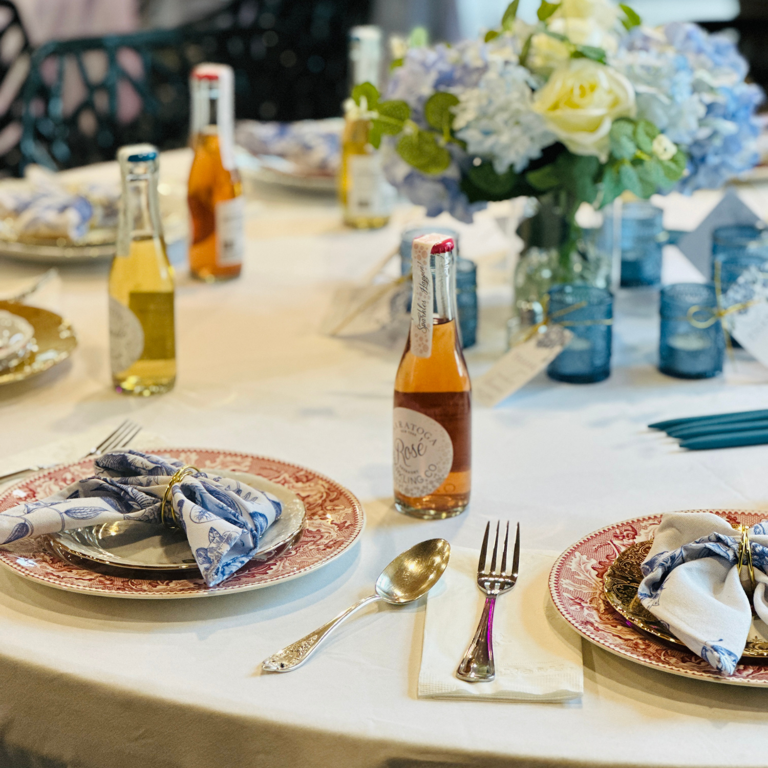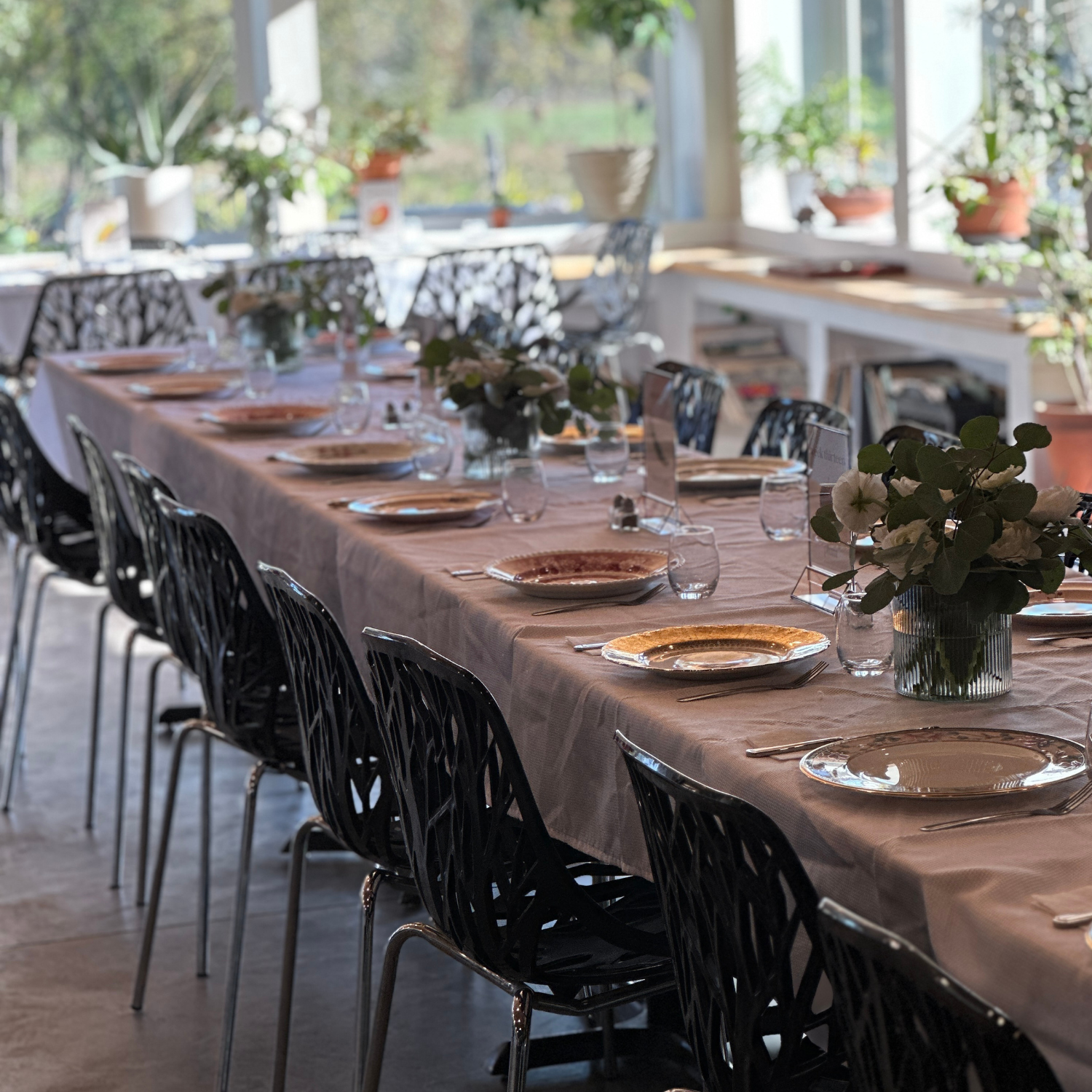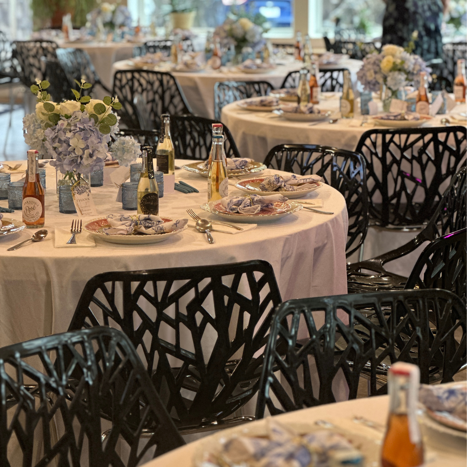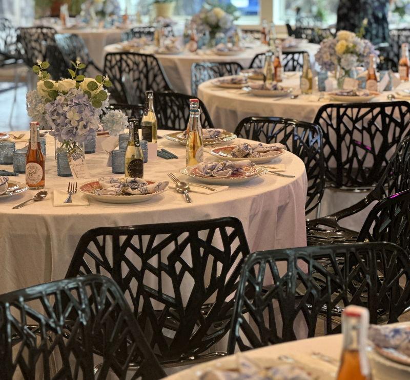 - Tables, chairs, linens, and flatware included