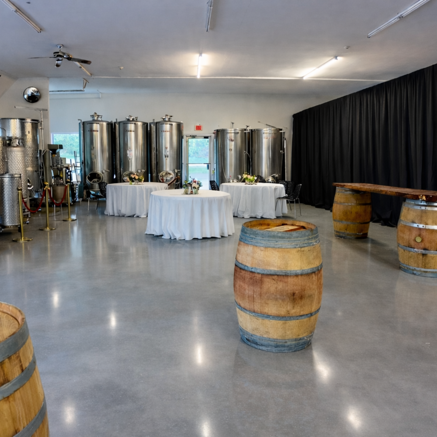 The tank and barrel room features event-ready amenities designed for a seamless reception meal, including dining tables and chairs, linens, flatware, dishes, and glassware. Adjustable lighting enhances the ambiance, while climate control ensures guest comfort throughout the evening. With easy access to restrooms, WiFi, and on-site support, the space is fully equipped for an elevated and effortless dining experience.