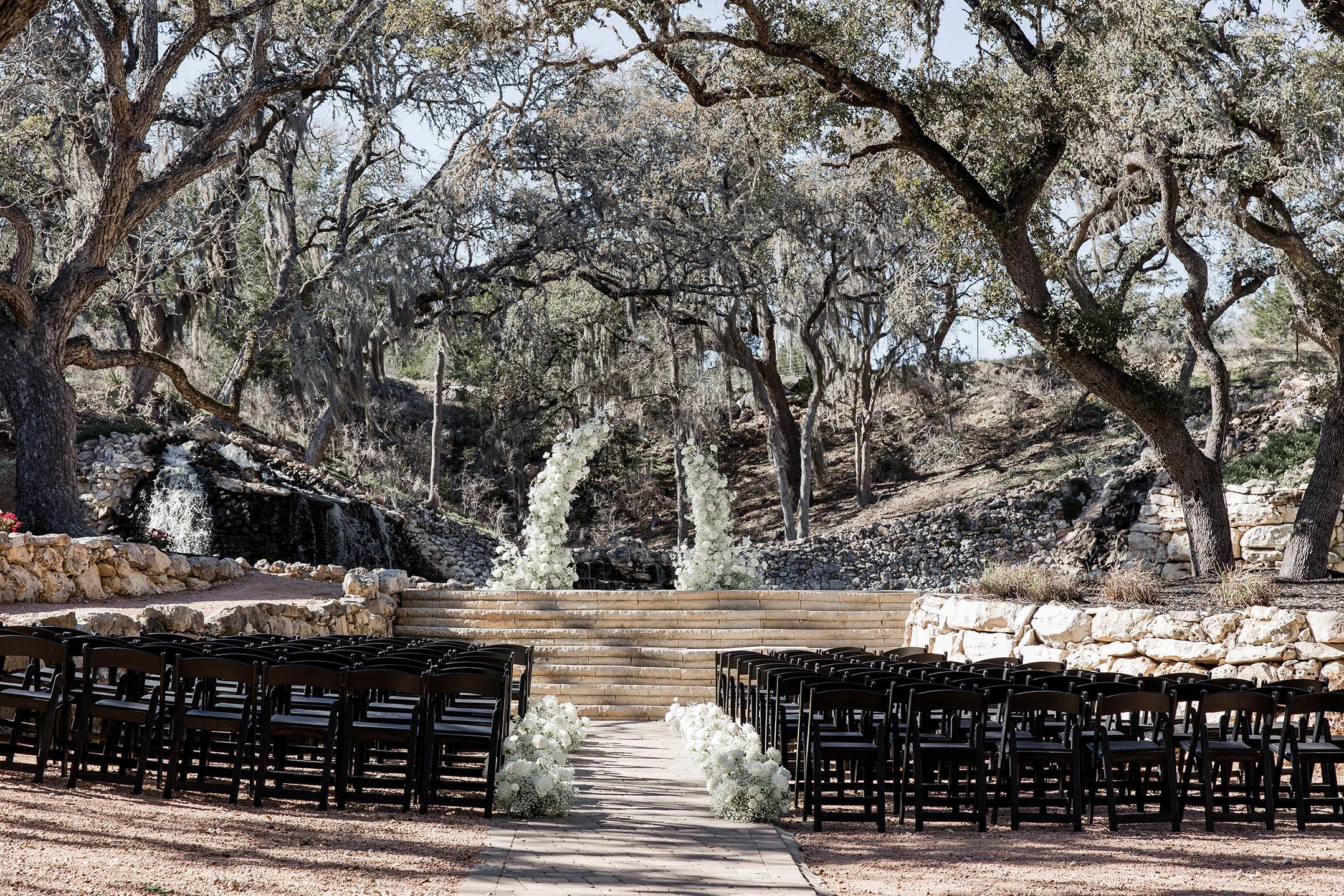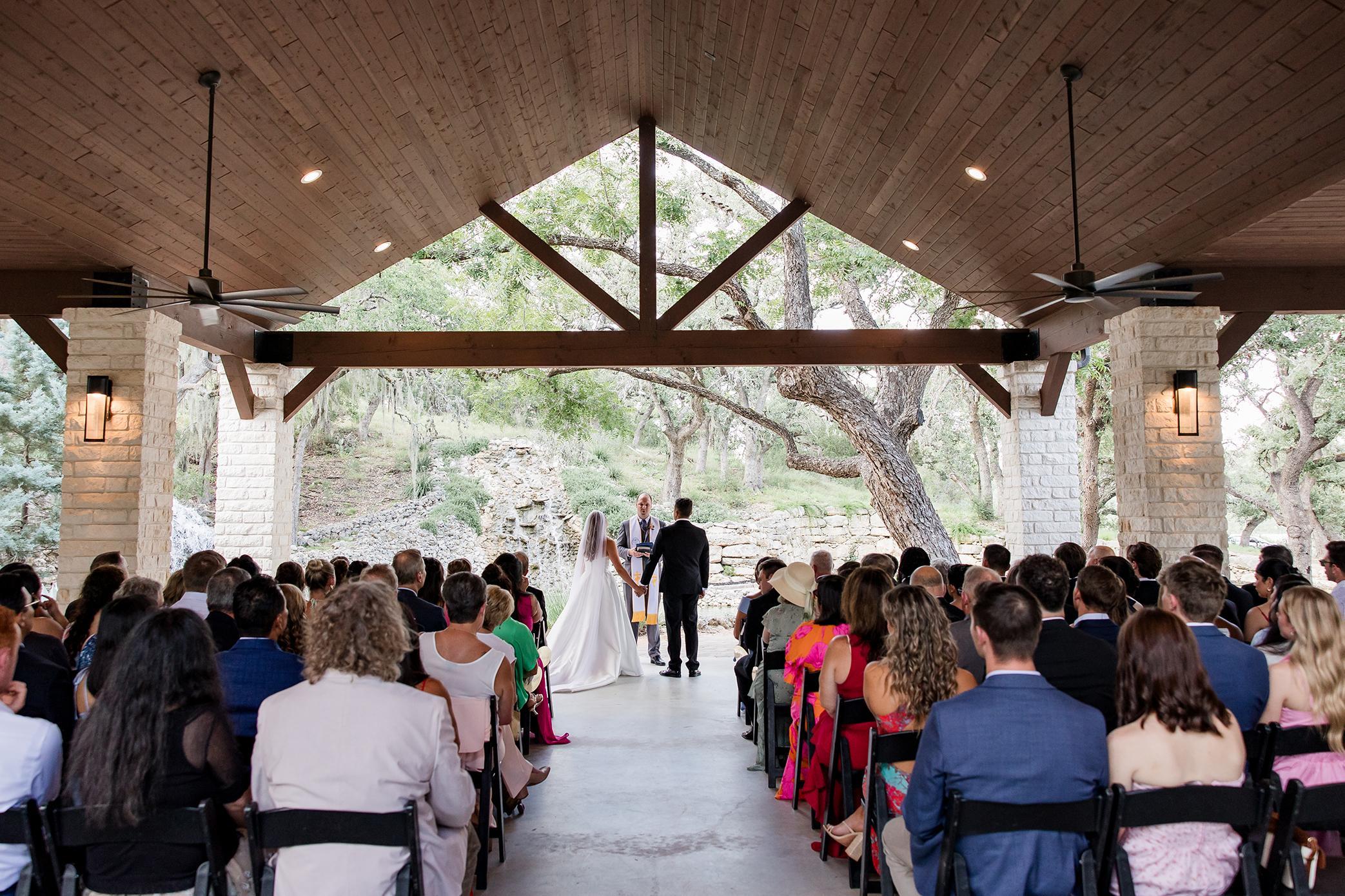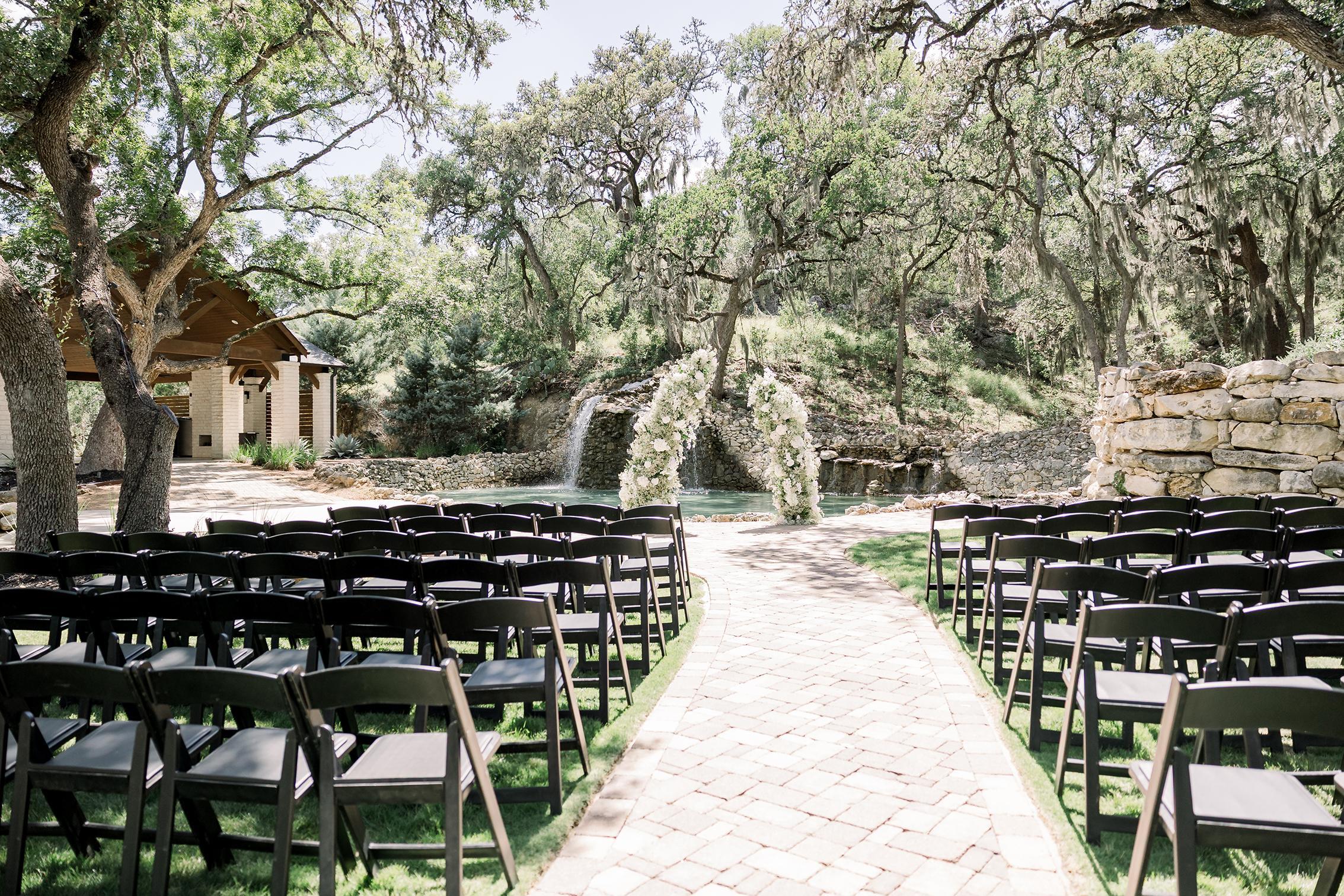 Overflowing with natural beauty in the form of waterfalls, native plants, and mature trees, Hayes Hollow embodies the true meaning of becoming one with nature. Tucked among 100-year-old oak trees, Hayes Hollow features a stunning open-air ceremony pavilion, cocktail patio, and spacious ballroom for a celebration your guests will be talking about for years to come. Breathtaking landscaping and water features make for surprises around every corner, and on-site lodging keeps the celebration going without interruption. Accommodating 250 guests, Hayes Hollow features an open-air pavilion, private wedding suites, and amazing views! Your magical day begins in one of two dedicated wedding suites, where you’ll relax in anticipation of your walk down the aisle in the company of friends and family. The transitional modern design of Hayes Hollow means there is little to do in terms of decor, the beauty of the waterfall ceremony backdrop provides a complementary palette to your outdoor ceremony.
