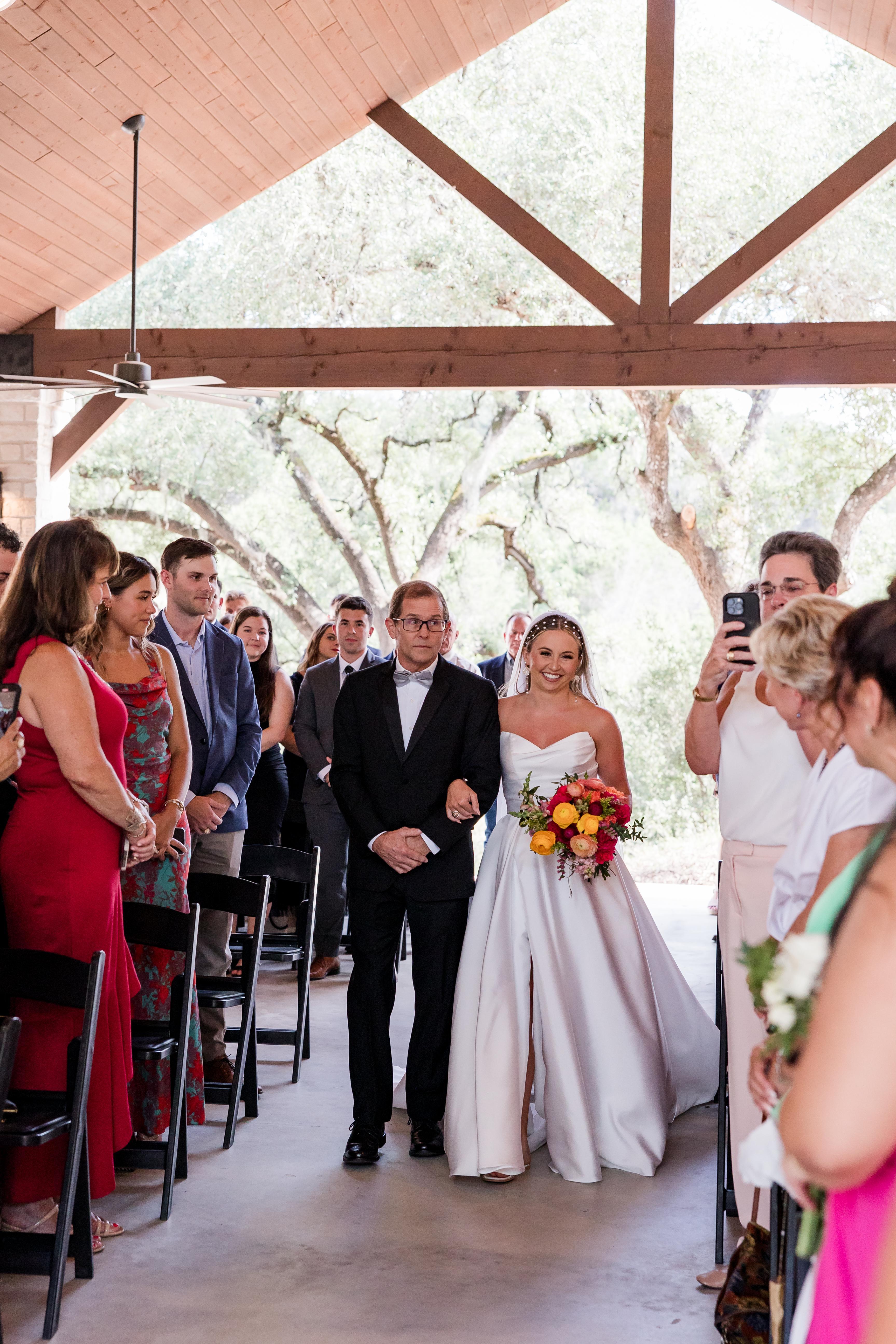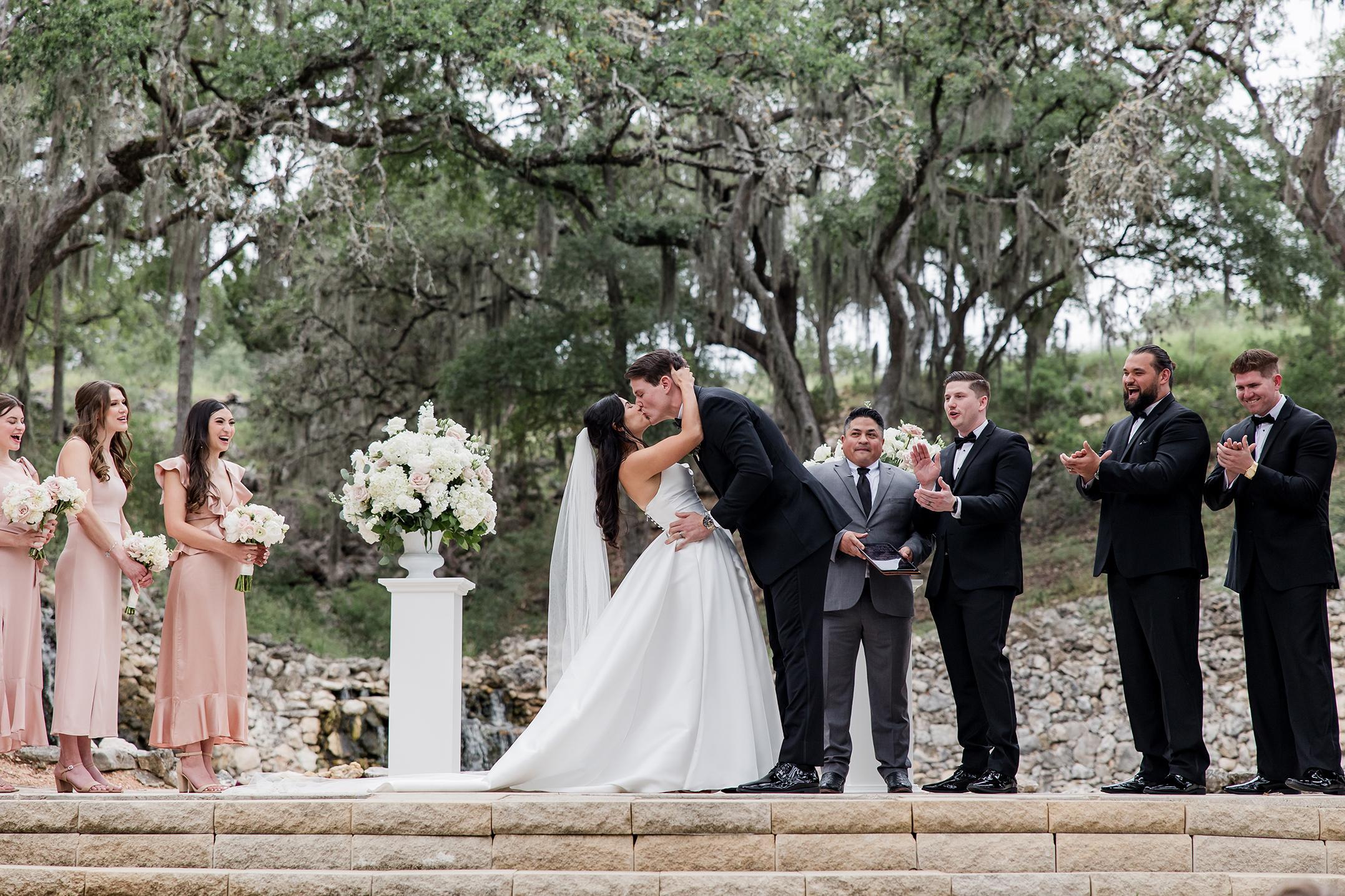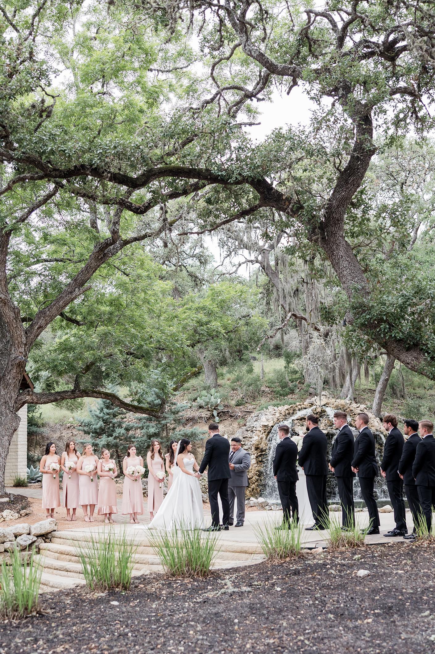 Overflowing with natural beauty in the form of waterfalls, native plants, and mature trees, Hayes Hollow embodies the true meaning of becoming one with nature. Tucked among 100-year-old oak trees, Hayes Hollow features a stunning open-air ceremony pavilion, cocktail patio, and spacious ballroom for a celebration your guests will be talking about for years to come. Breathtaking landscaping and water features make for surprises around every corner, and on-site lodging keeps the celebration going without interruption. Accommodating 250 guests, Hayes Hollow features an open-air pavilion, private wedding suites, and amazing views! Your magical day begins in one of two dedicated wedding suites, where you’ll relax in anticipation of your walk down the aisle in the company of friends and family. The transitional modern design of Hayes Hollow means there is little to do in terms of decor, the beauty of the waterfall ceremony backdrop provides a complementary palette to your outdoor ceremony.