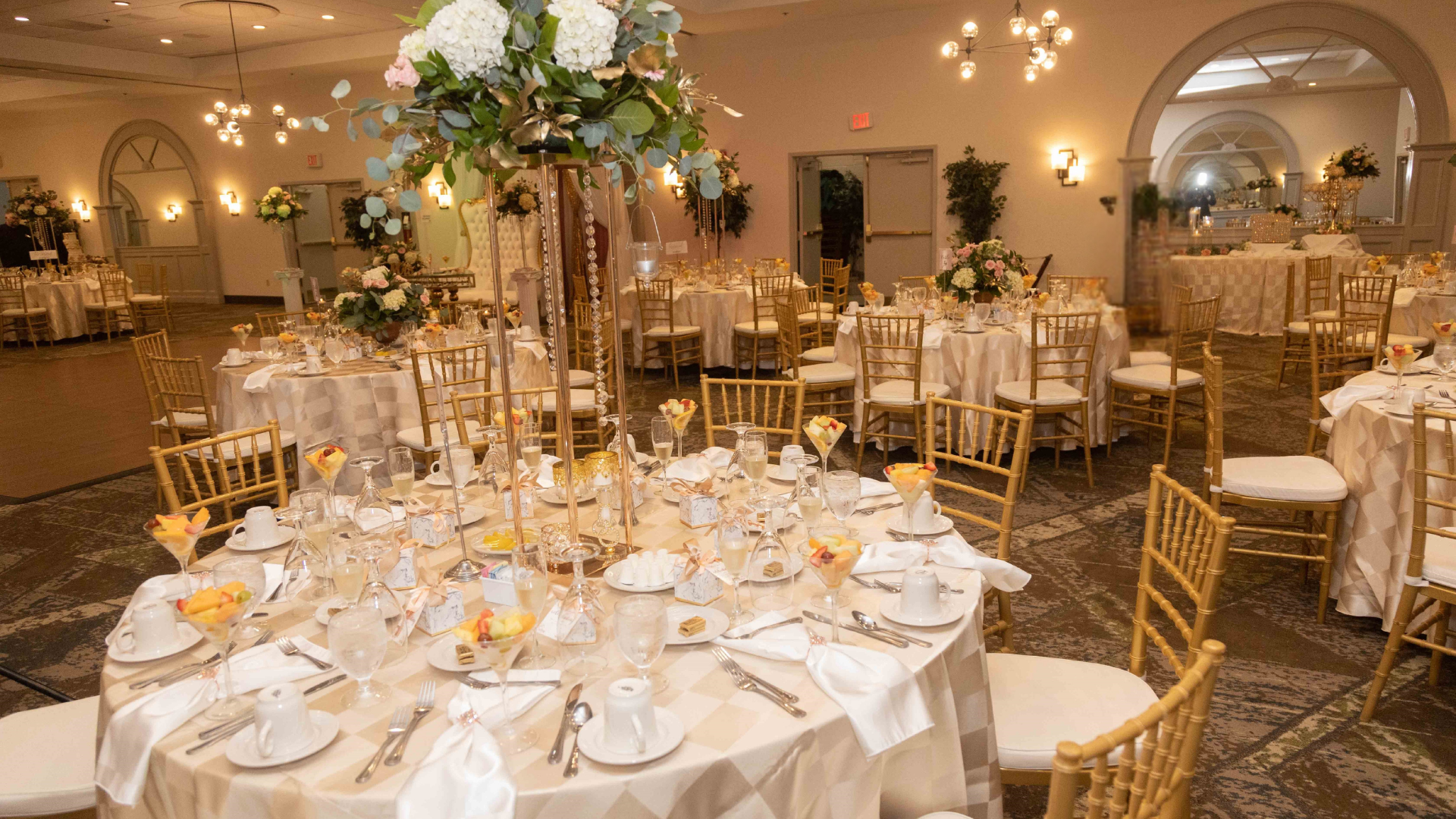 3,868 sq ft of banquet space, featuring wall mirrors and chandeliers