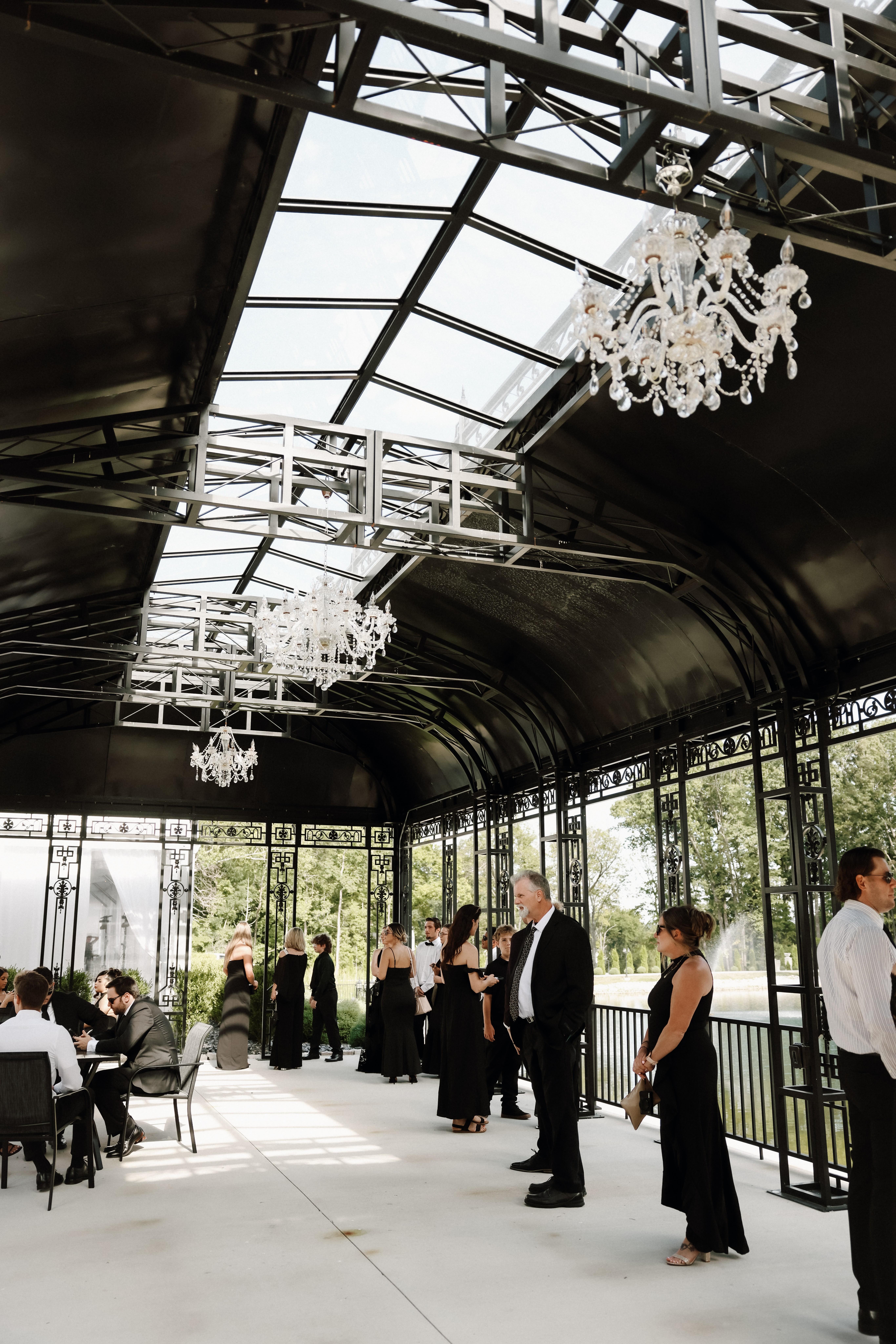 The lakeside solarium, adorned with crystal chandeliers and flowing drapery, accommodates up to 225 guests. The Bridal Suite and Groom’s Quarters are included with your booking. The Bridal Suite offers five mirrored salon stations, a stylish lounge, two private dressing rooms, and a kitchenette with a coffee station. The Groom’s Quarters at The Lake includes an arcade & game lounge, smoke lounge, pickle ball court, putting green, billiards room, and private dressing area.