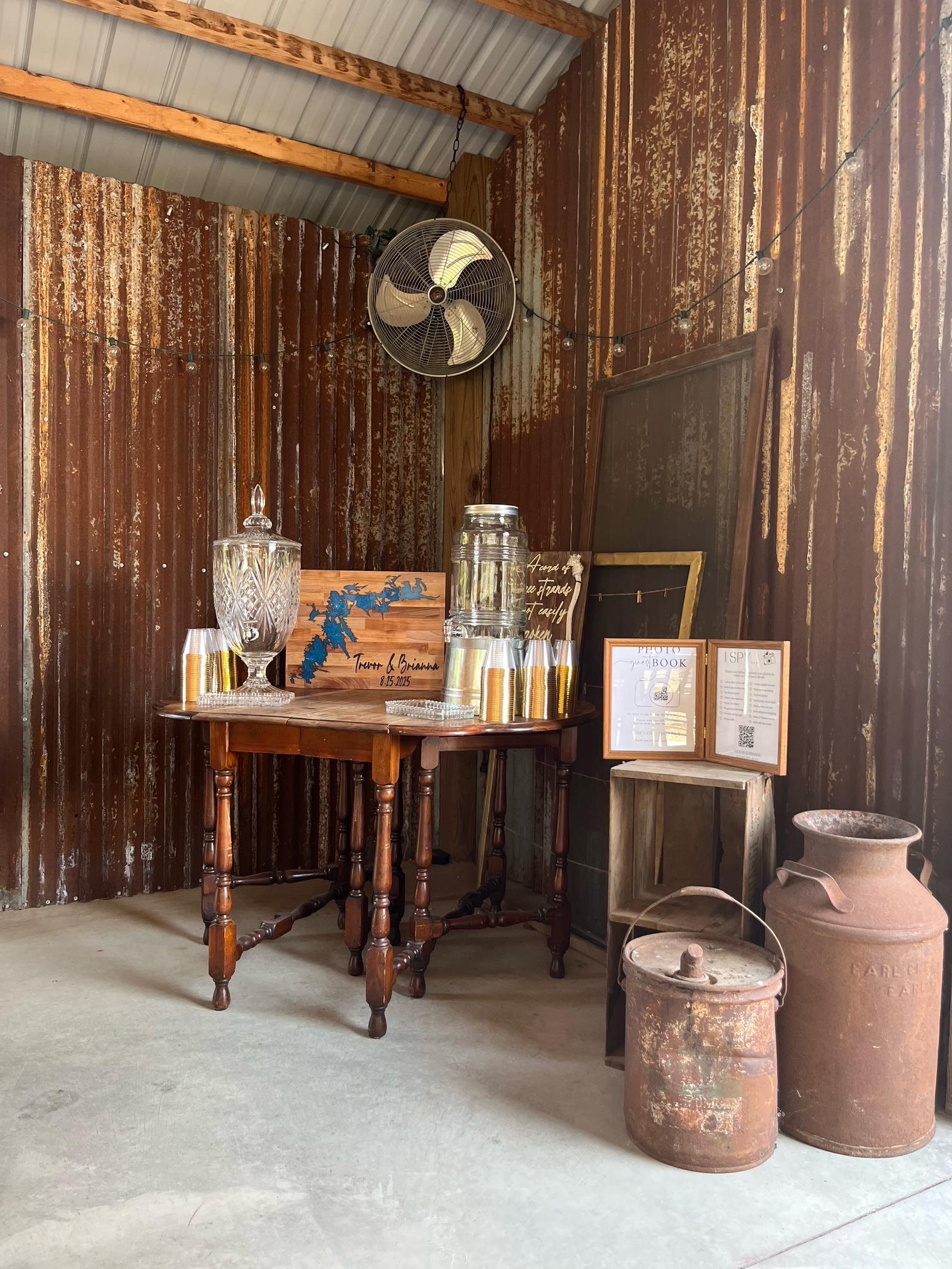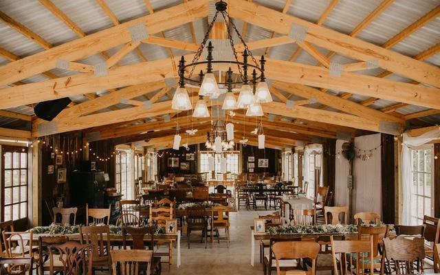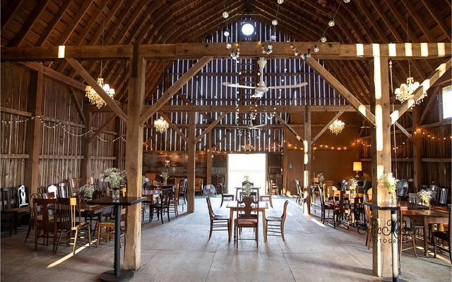 -handmade barn wood event tables (warm, rustic tables waiting for your decor but needing no linens - let their beauty shine through) -150 mismatched, vintage chairs -surrounding outdoor seating perfect for cocktail hour or casual overflow -sliding glass barn doors that protect from the chill and rain while sliding fully open to allow in the warmth and breeze -chandeliers and twinkling lights to create a welcoming ambiance -ceiling fans for warm summer days