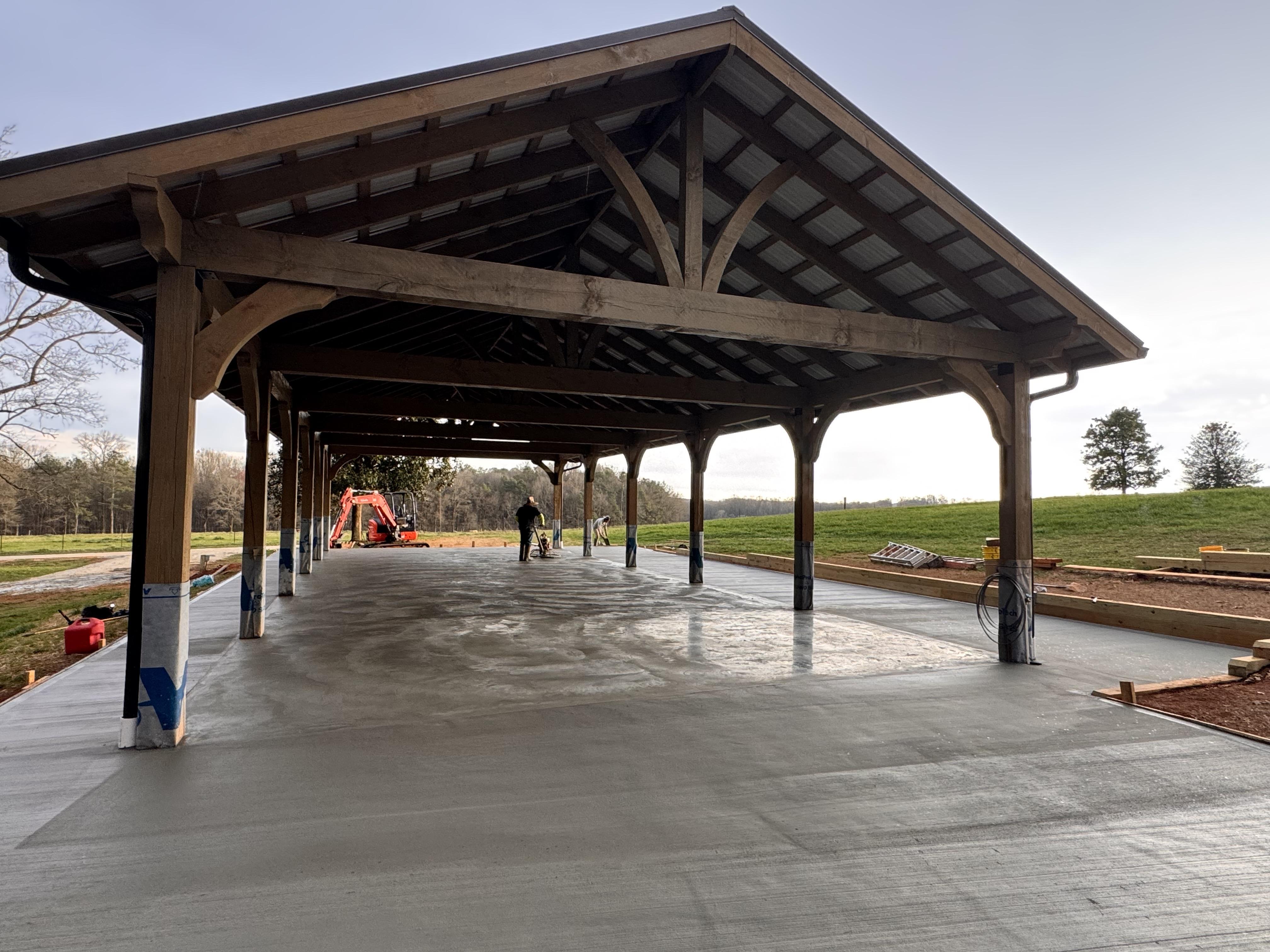 Our brand new Magnolia Hall reception pavilion was built to compliment Mulberry Chapel, with matching post and beam construction and sweeping views of nature. Large and open concrete floor that spills out to an outdoor patio and brick courtyard.
