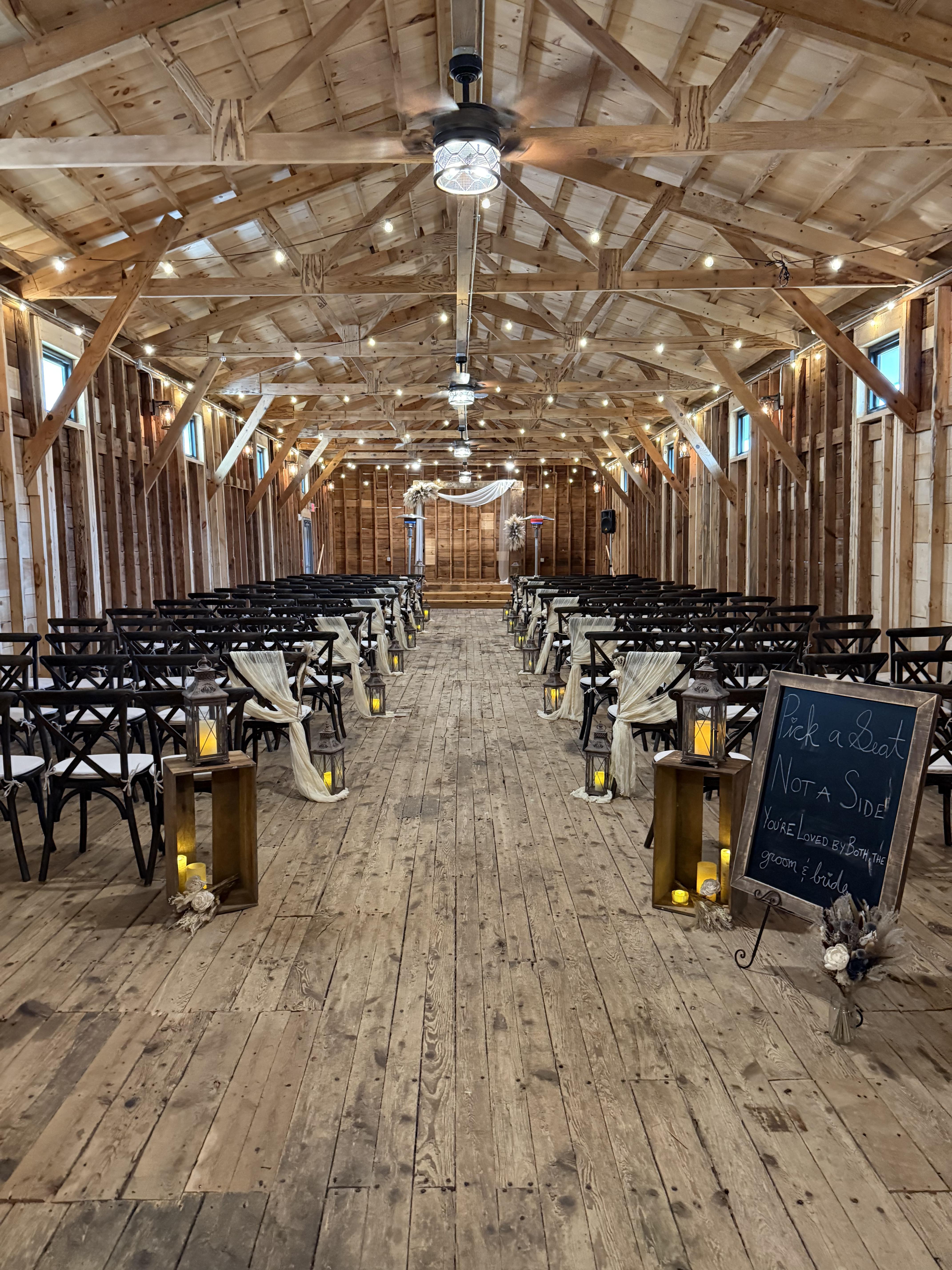 -4 queen size beds in the "bride" suite -8 twin size beds in the "groom" suite -1 queen size bed in the "honeymoon" suite -Wheelchair accessible facilities -TV, couch(es), mini bar, Keurig coffee maker, Bluetooth sound system, table and chairs, linens, towels, and full bathroom in the "bride" and "groom" suites -Mini fridge and full bathrooms in all suites -Half bathroom for guests to use -Outdoor fireplace -Ceremony chairs -Ceremony arch -Day of coordinator