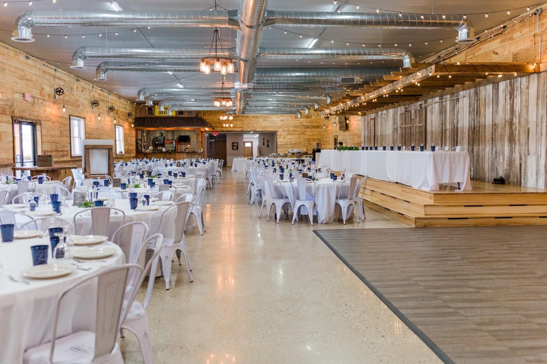 Our climate-controlled reception venue seats up to 350 guests and features an elevated stage for the bridal party, a spacious dance floor, bar, cocktail tables, cozy seating area, limited decorations, and serving kitchen. Amenities vary by package. Contact us to learn more and schedule a tour!