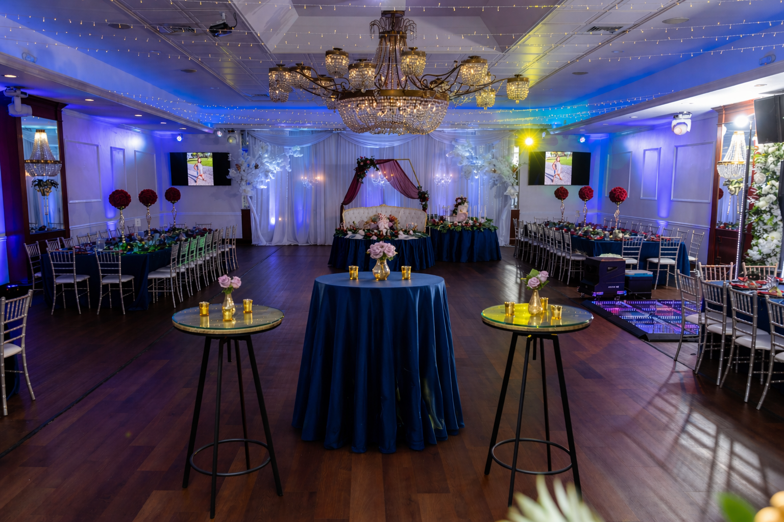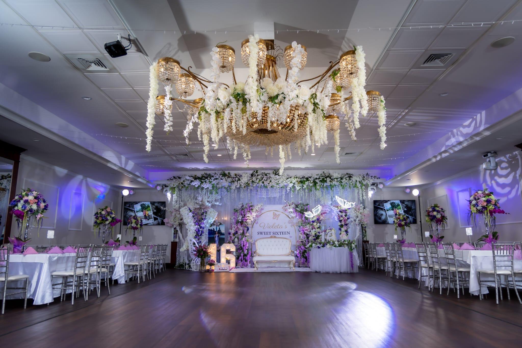 -Elegant banquet room with stylish, modern updates -Oversized crystal chandeliers -Spacious dance floor -New silver-champagne Chiavari chairs -Built-in sound system, LED lighting, and flat screens -Dedicated space for DJs and vendors -A wide range of decorative add-ons available through partner vendors!