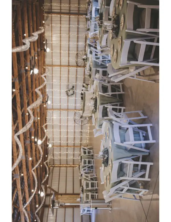 The adorable 5,000-square-foot red barn at Sackett Ranch can accommodate up to 200 people for dinner and dancing. This cavernous building features exposed beams, a lofted ceiling, unique lighting fixtures, a built-in bar, and a white hearth. The interior is decorated with retro accents including wooden wheels, oak barrels, settees, cowhide sofa chairs, and vintage white doors.