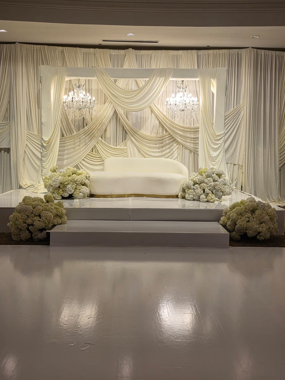 Exuding European-inspired elegance, our venue boasts a classic marble floor adorned with crystal chandeliers, Victorian-style couches, a large mirror, and a marble console for the reception desk.