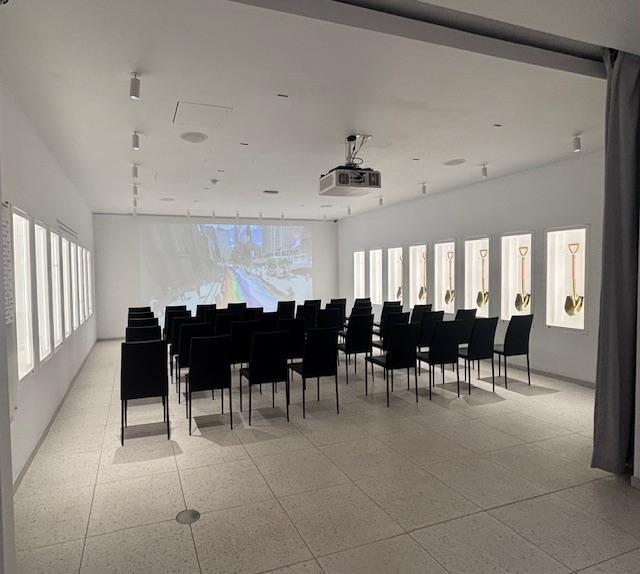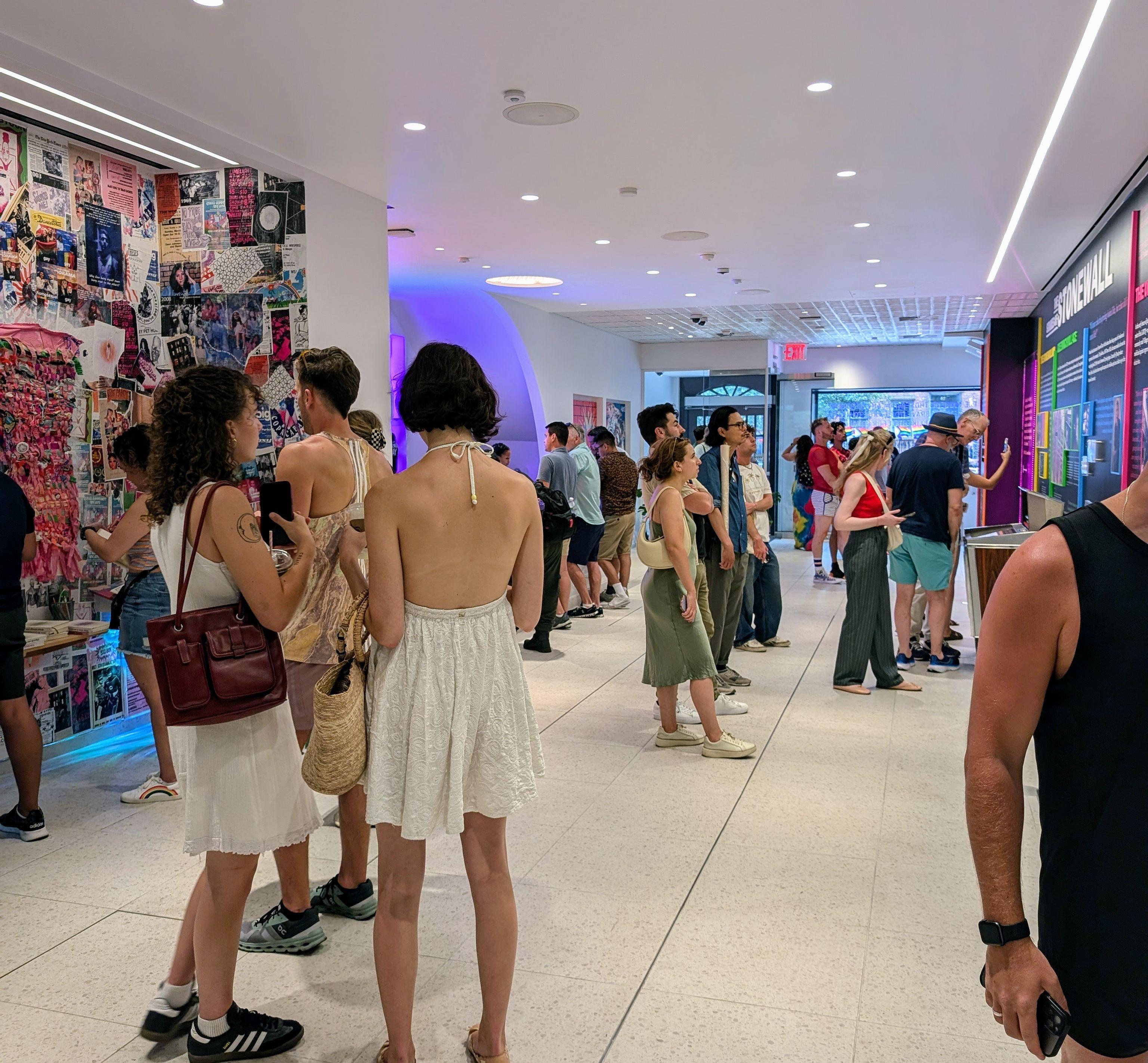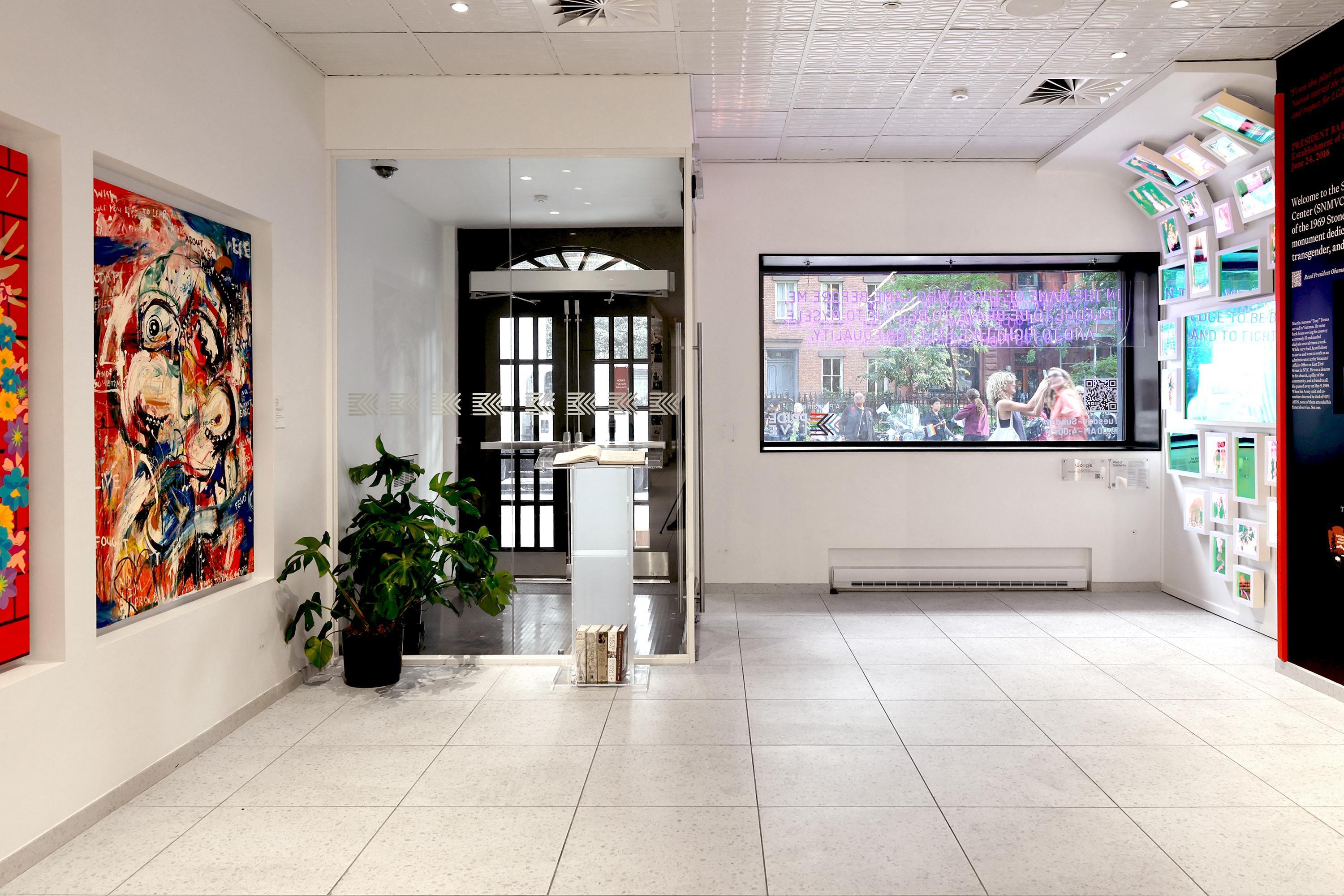 The Gallery is a sleek, contemporary space that serves as both a sophisticated event hall and an inspiring historical archive. The room is defined by its clean, minimalist aesthetic, featuring polished tile floors and bright white walls that act as a crisp canvas for vibrant, large-scale artwork and immersive historical exhibits. On one side, a dedicated theater area offers a structured setting for ceremonies, featuring rows of modern black seating and a wide projection screen for storytelling or cinematic visuals. The walls are lined with illuminated displays, including a series of symbolic golden shovels and interactive media installations that celebrate LGBTQ+ history. Floor-to-ceiling glass at the entrance creates a seamless connection to the historic streets of Greenwich Village, flooding the space with natural light and urban energy.