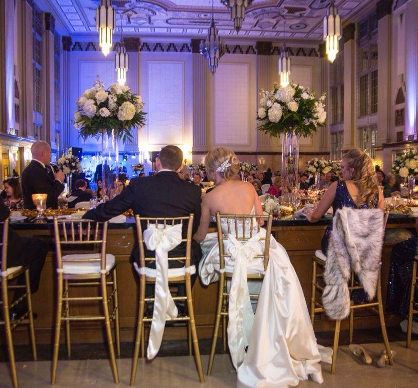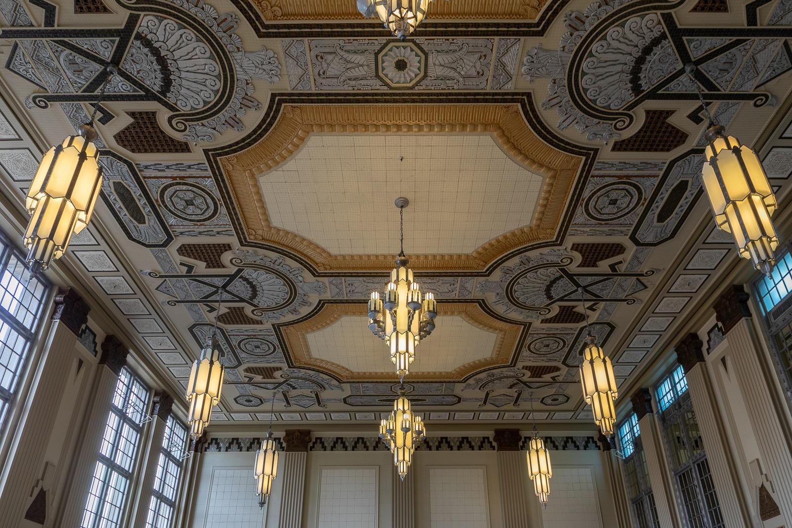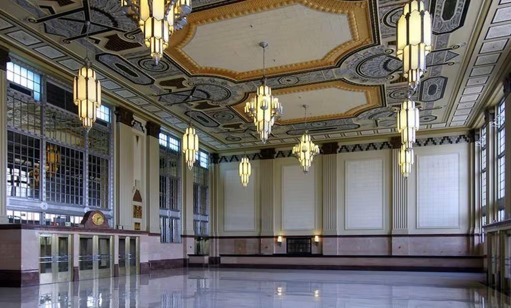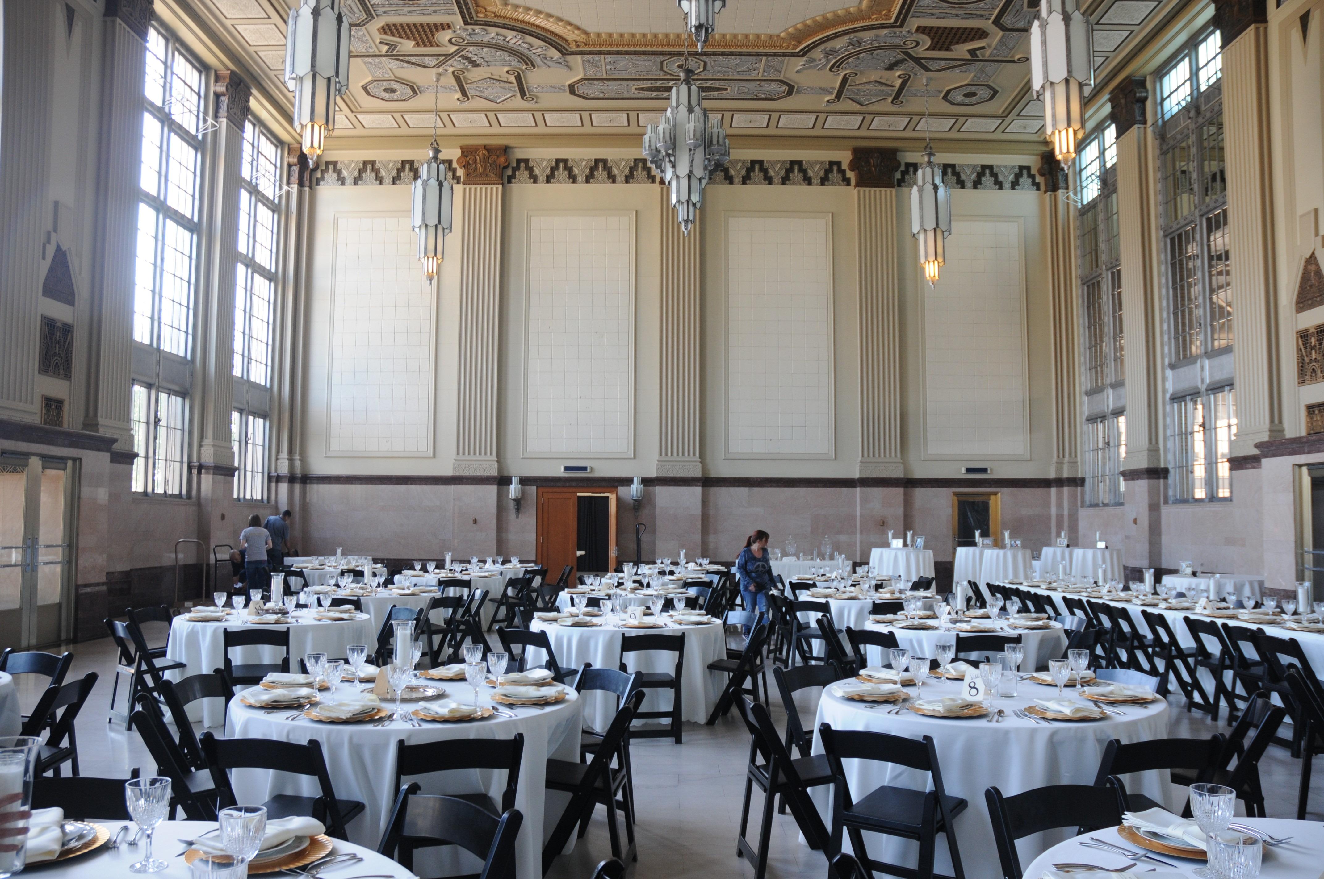 The Grand Hall at The Ballroom at T&P Station offers an unparalleled setting for couples seeking a wedding venue with true historic gravity. This breathtaking space is defined by its soaring ceilings, which feature intricate Art Deco plasterwork and hand-painted geometric motifs in shades of gold, cream, and silver. The hall is illuminated by a series of massive, multi-tiered frosted glass chandeliers that cast a regal, vintage glow over the polished marble floors.