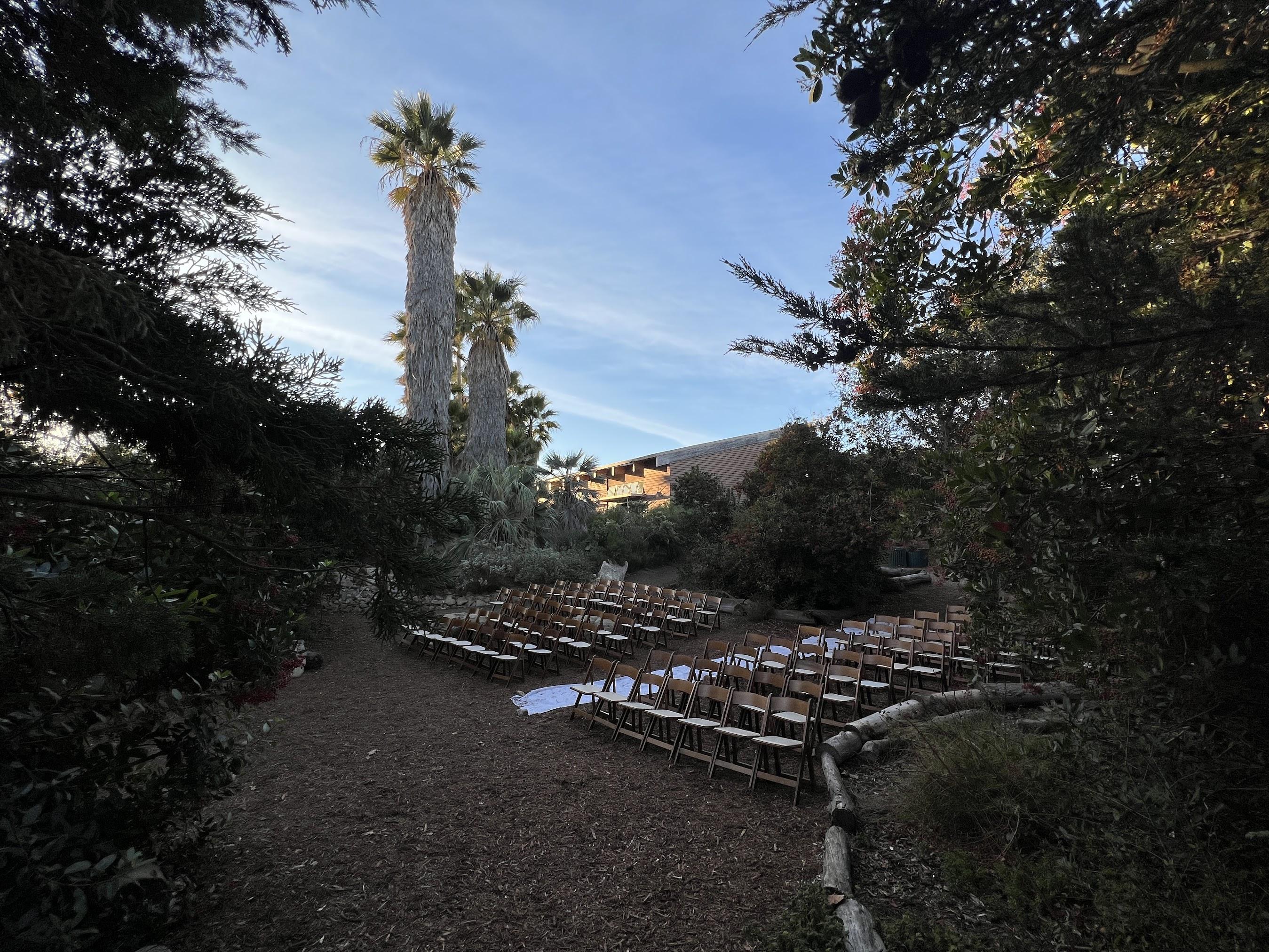 The towering palms and natural brush make for a charming natural setting, a perfect escape from the urban surroundings. With the addition of rows of chairs and a personal backdrop, this space is perfect for a scenic wedding ceremony.