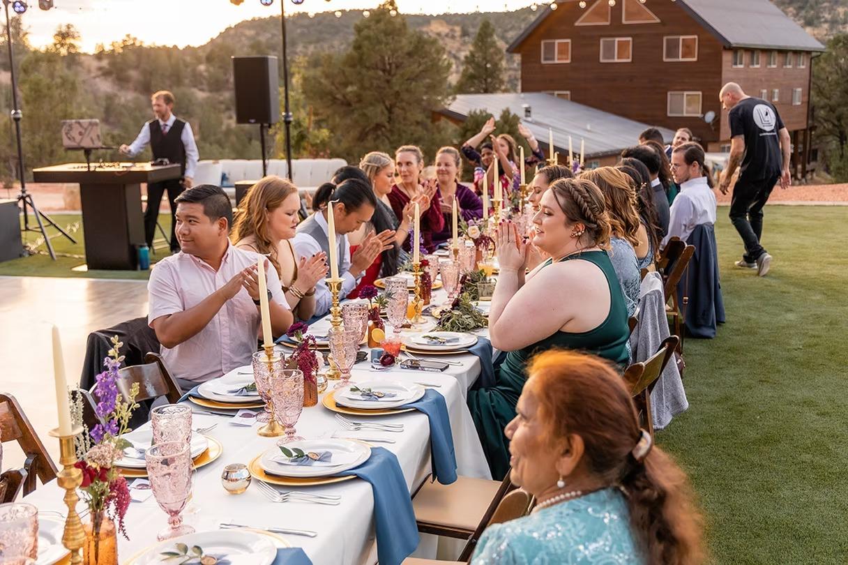 Our outdoor event space features a manicured synthetic lawn and a rustic timber arch, perfect for a ceremony under the desert sun or a reception beneath a blanket of stars. For added peace of mind, a stylish, powered event tent provides a versatile, weather-protected setting without sacrificing the view. Guests can transition from the ceremony to the group fire pit for cozy late-night gatherings, all while staying steps away from the main lodge’s custom-renovated living areas and scenic wrap-around decks.