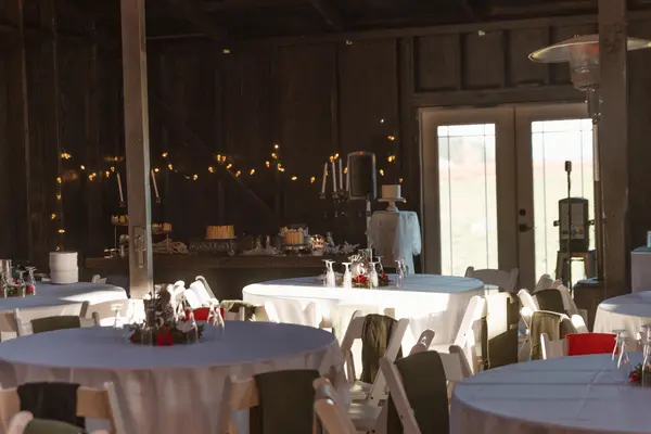 The covered reception pavilion is an ideal space for the summer weddings with sliding barn doors, french doors, and fans for that open air feel.