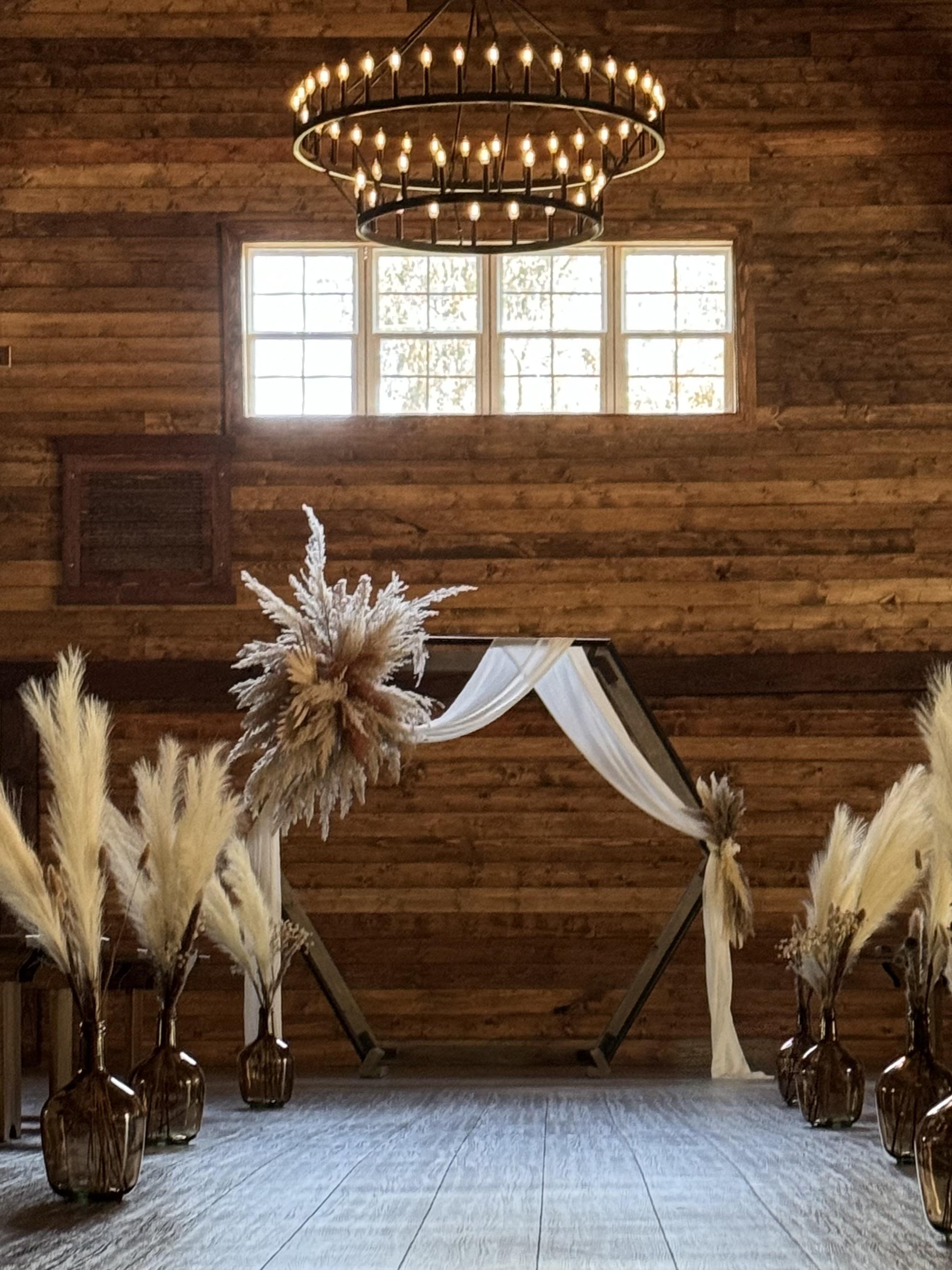 The Lodge serves as the heart of the property, blending rustic charm with modern comfort. Inside, the Indoor Ceremony Hall features soaring wood ceilings and four grand chandeliers that add a touch of elegance to the rustic aesthetic.