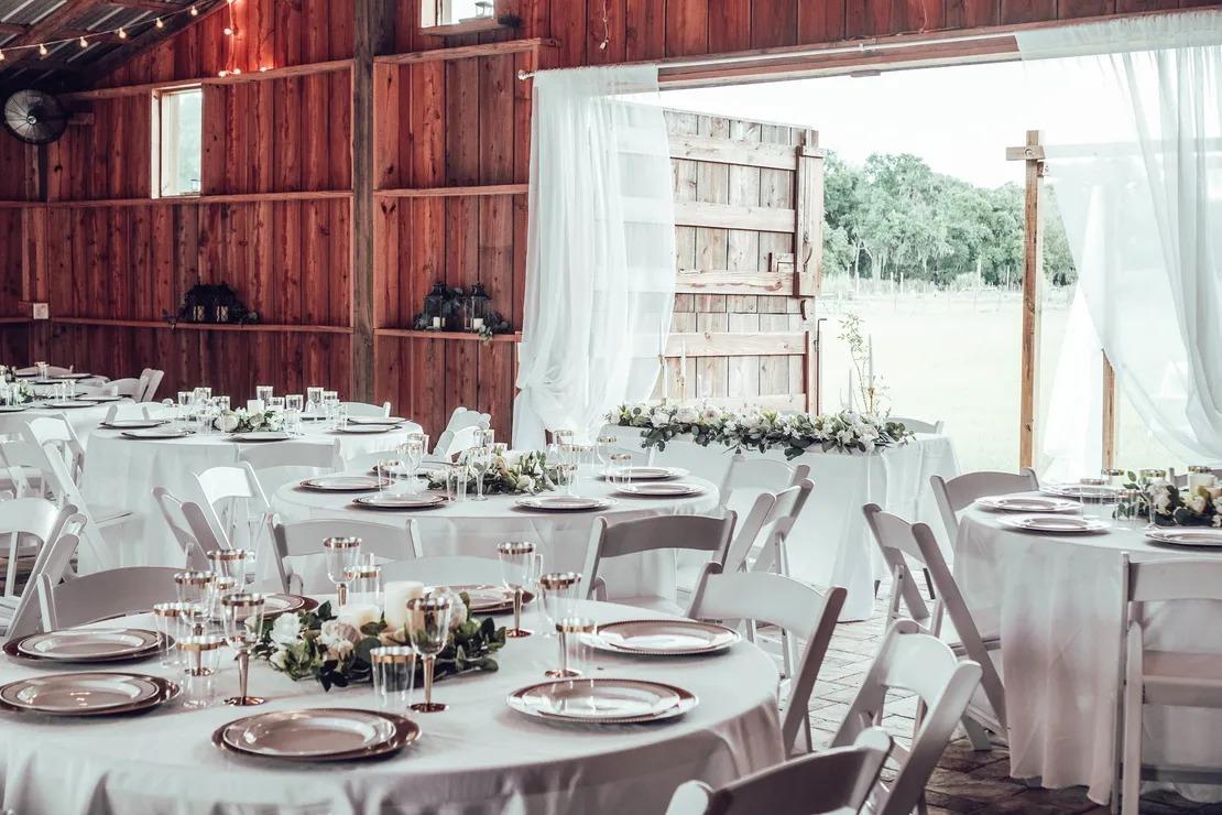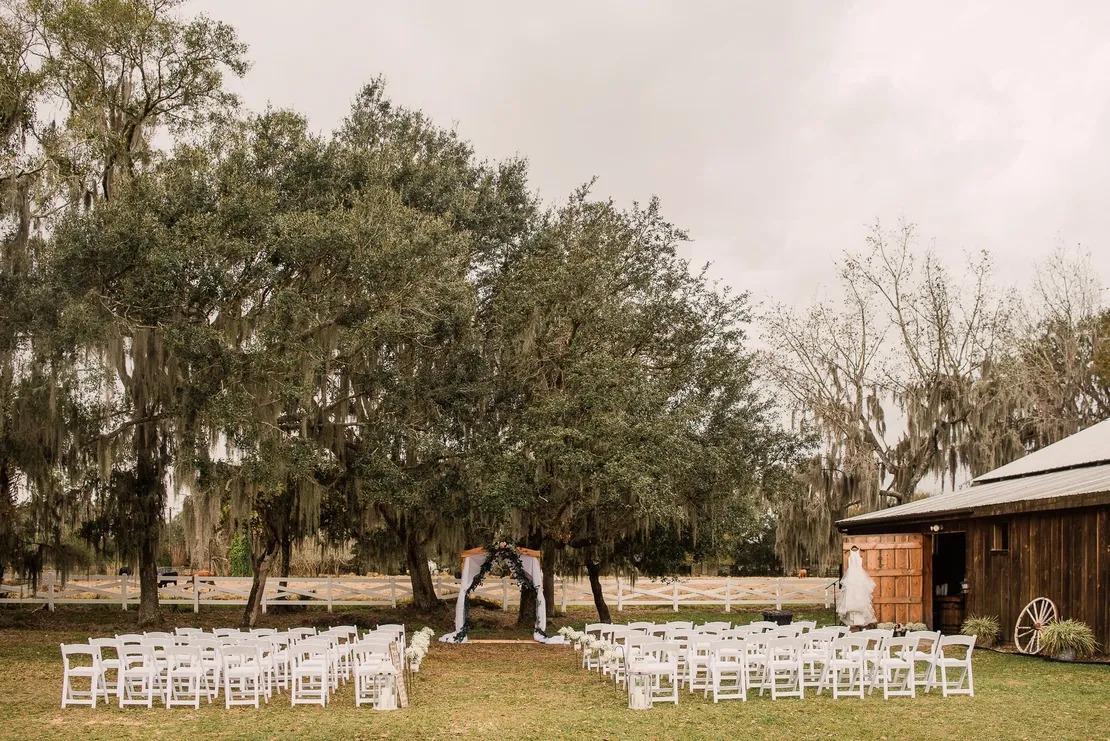 The Sparrow Barn is a family-owned wedding venue tucked beneath oak trees in the countryside just outside of Tampa. Designed with a mix of southern elegance and rustic charm, the space features hand-crafted woodwork, chandeliers, twinkle lights, and a lighted covered dance floor that creates a warm, romantic atmosphere from day to night. Our venue comfortably accommodates up to 120 seated guests and offers both indoor and outdoor spaces, including a scenic ceremony garden and a beautifully styled, air-conditioned barn for the reception. Couples love the relaxed, private setting and the flexibility we offer—whether you want to bring in your own vendors or choose a more all-inclusive, stress-free experience. What really sets us apart is the feeling here. It’s peaceful, personal, and intentionally designed to make your day feel easy, natural, and genuinely special—not rushed or overly complicated.
