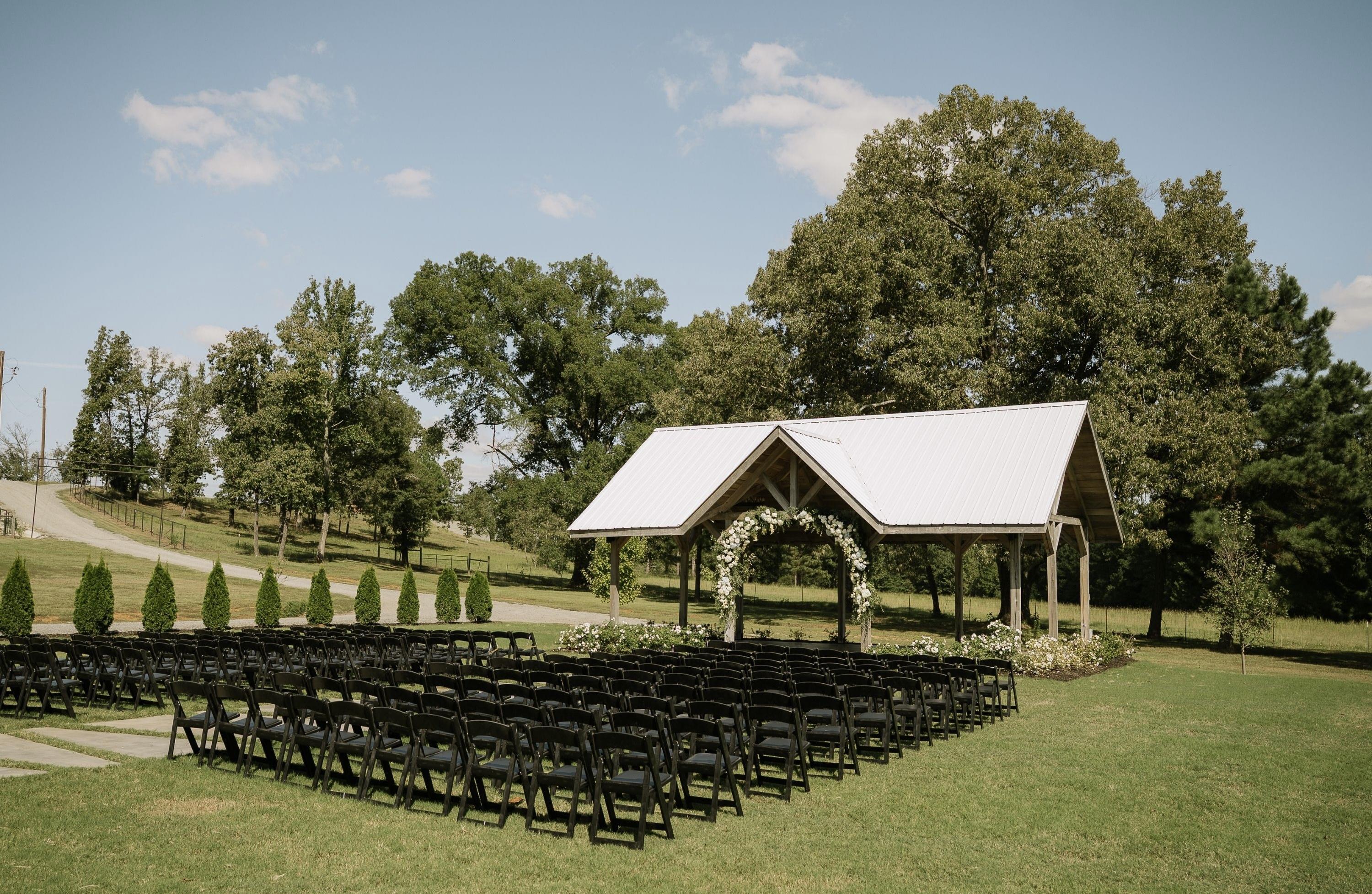 Ample space for wedding party and wedding guest, covered pavilion, electric hookups for speakers or DJ, horse and carriage entrance, huge sliding door entrances, silo bar for pre wedding drinks, 250 folding ceremony chairs, secluded landscape, sparkler exit, outdoor lighting
