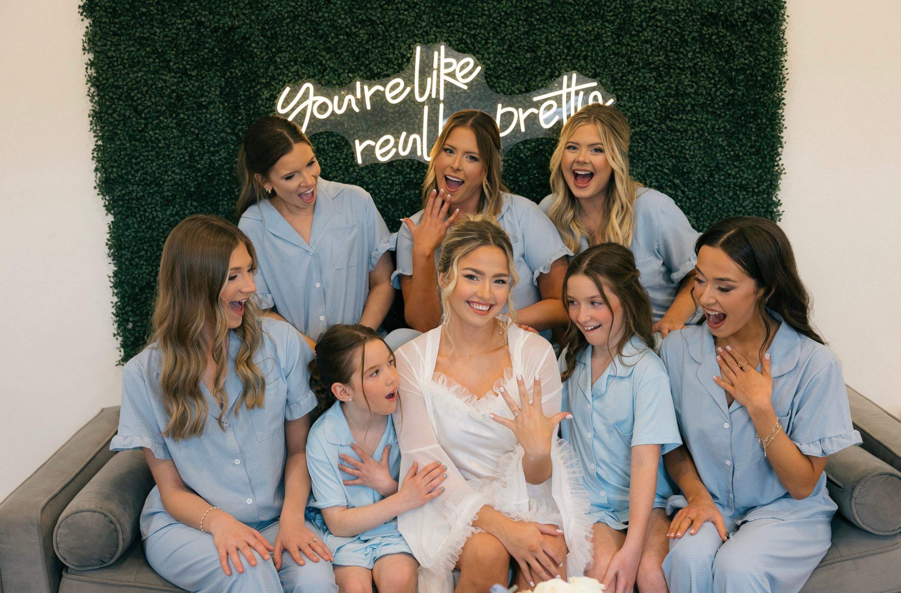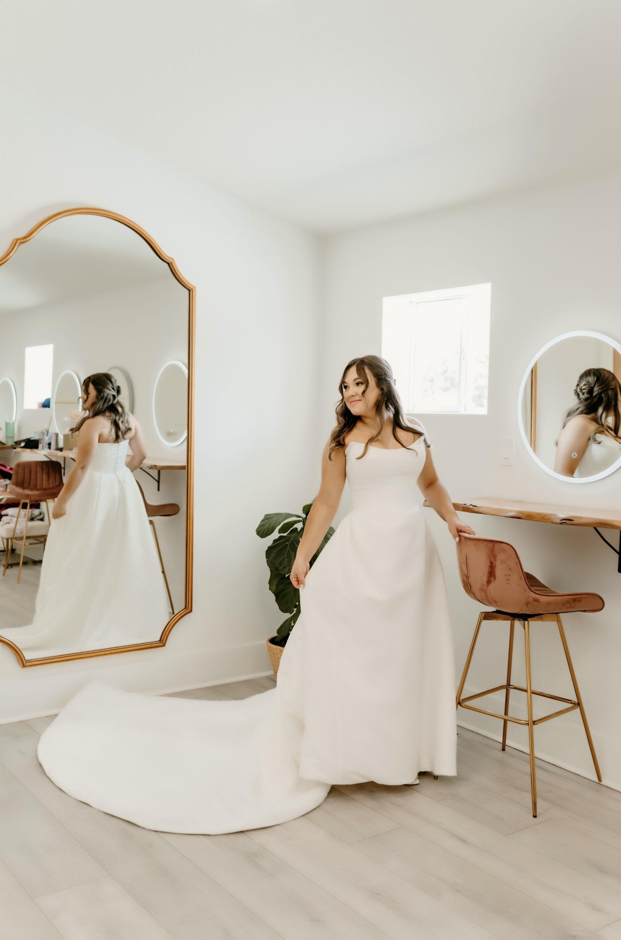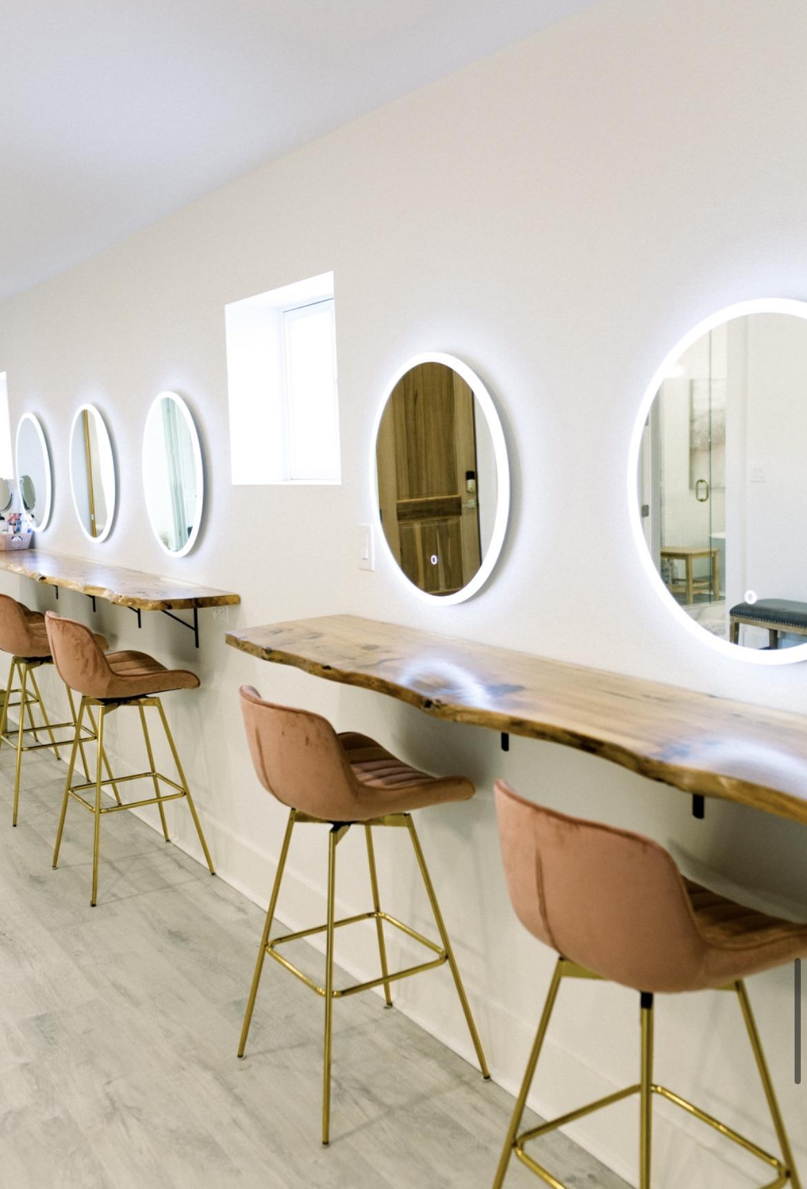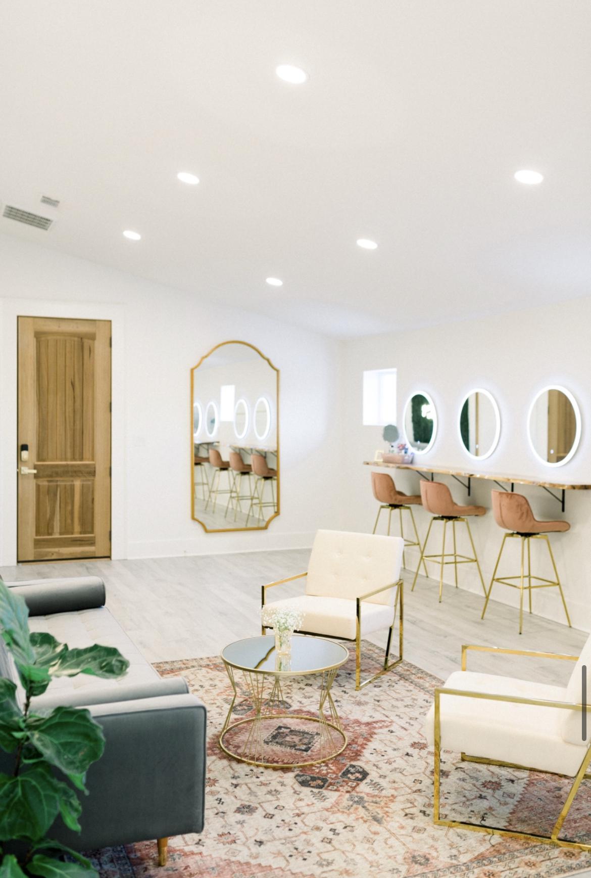 Spacious room with six makeup stations, dress rack, hook for brides dress, comfy lounge furniture, Bluetooth speaker, steamer, wine cooler, natural light, oversized mirror, private bathroom with heated floors, private entrance to balcony