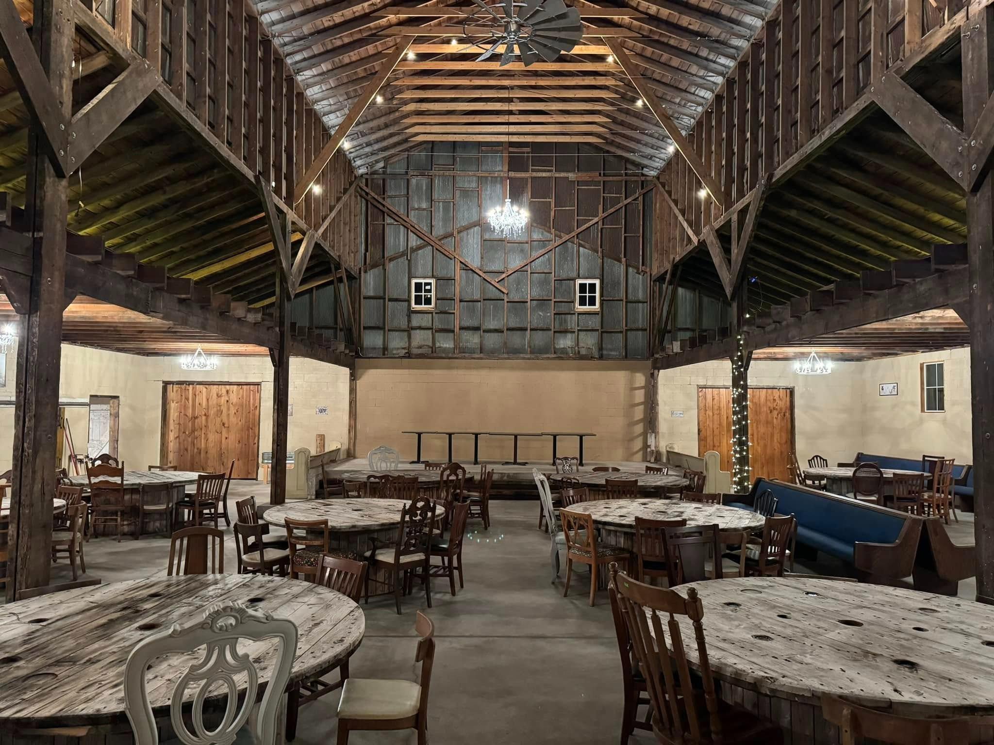 A 3,600 square foot restored barn with original shape, updated features like a bar, and romantic chandelier lighting.