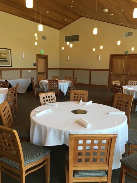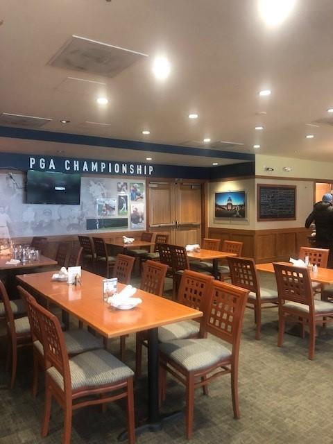 This space features floor to ceiling windows and a large balcony overlooking Harding's historic #18th fairway