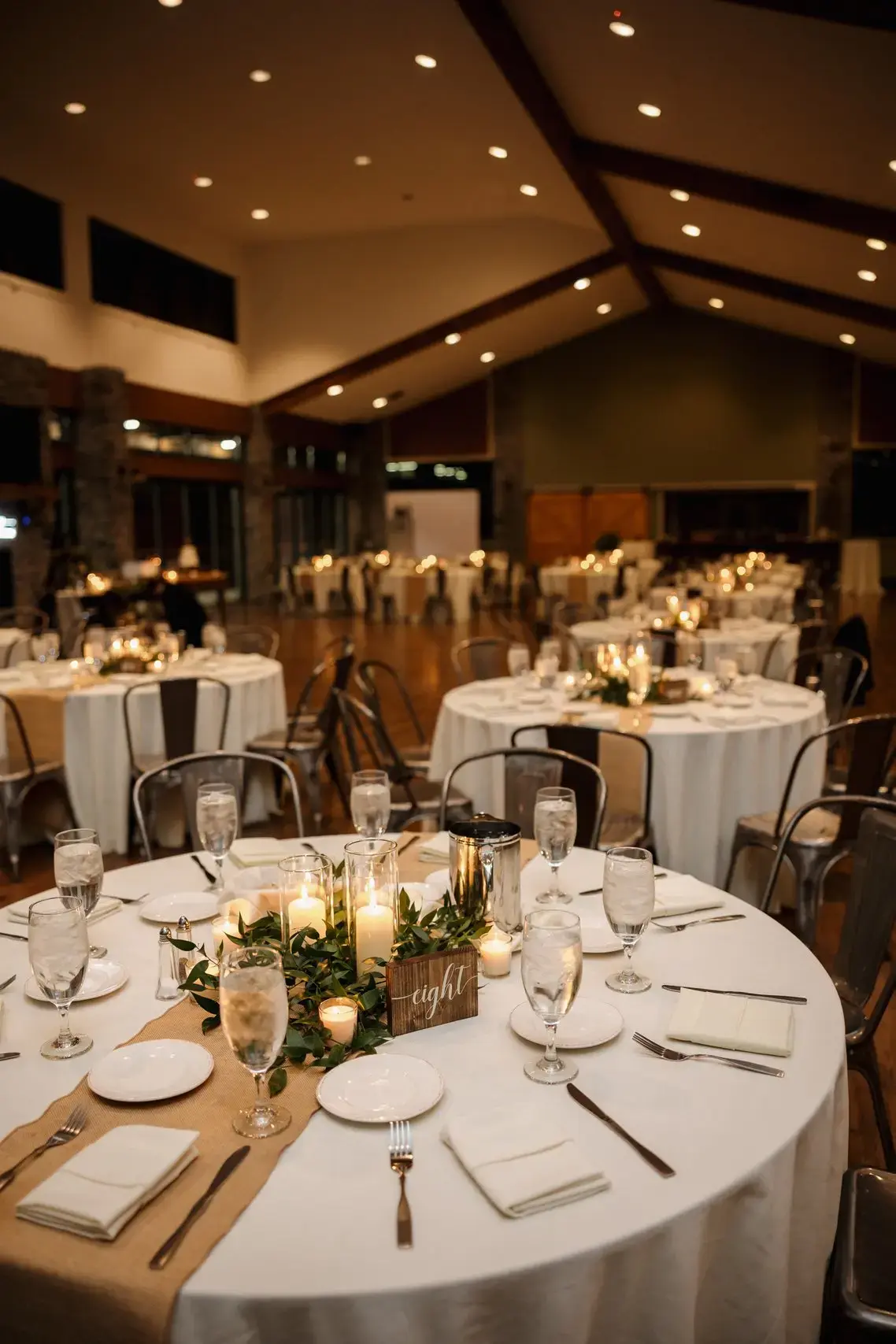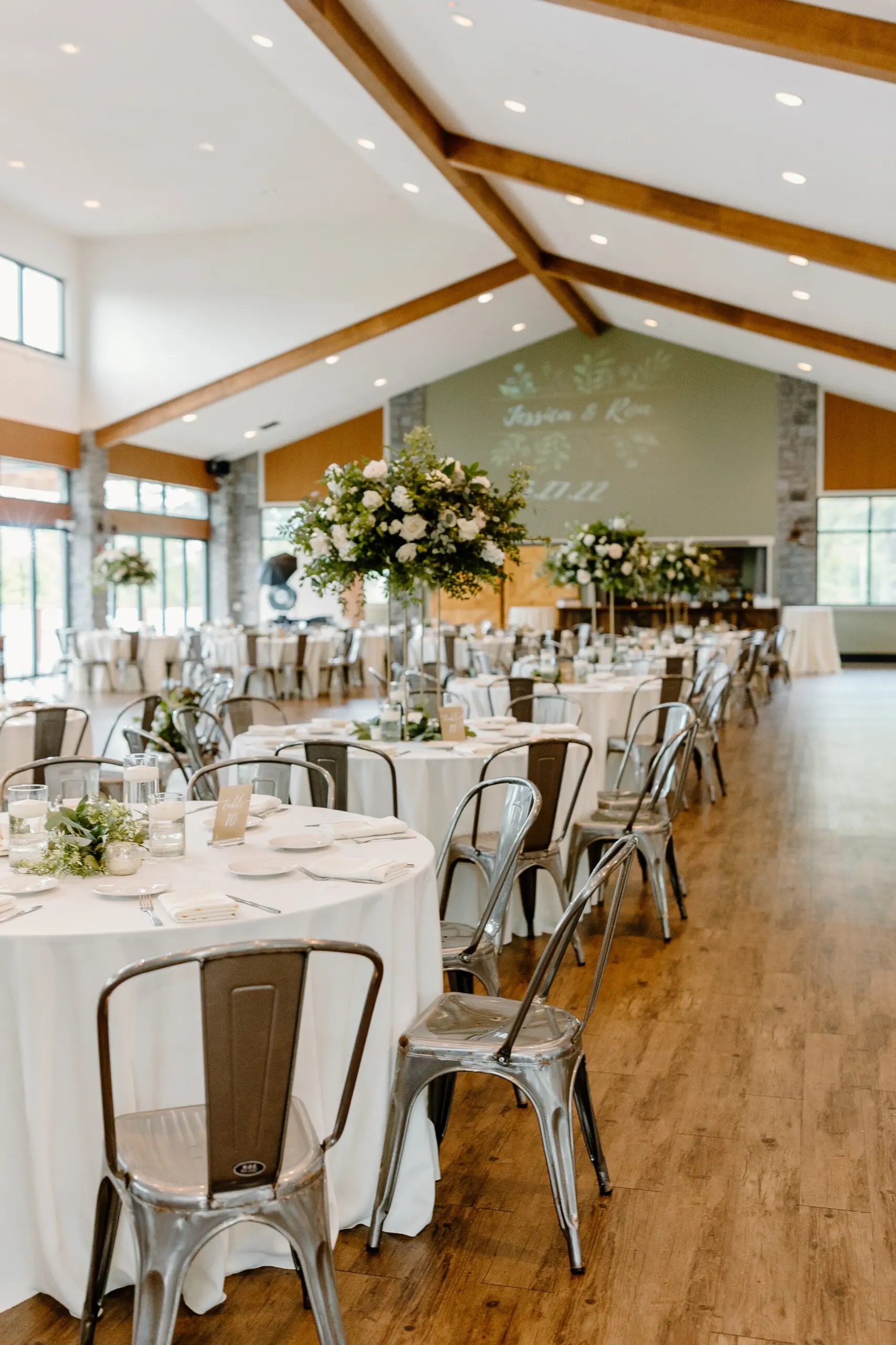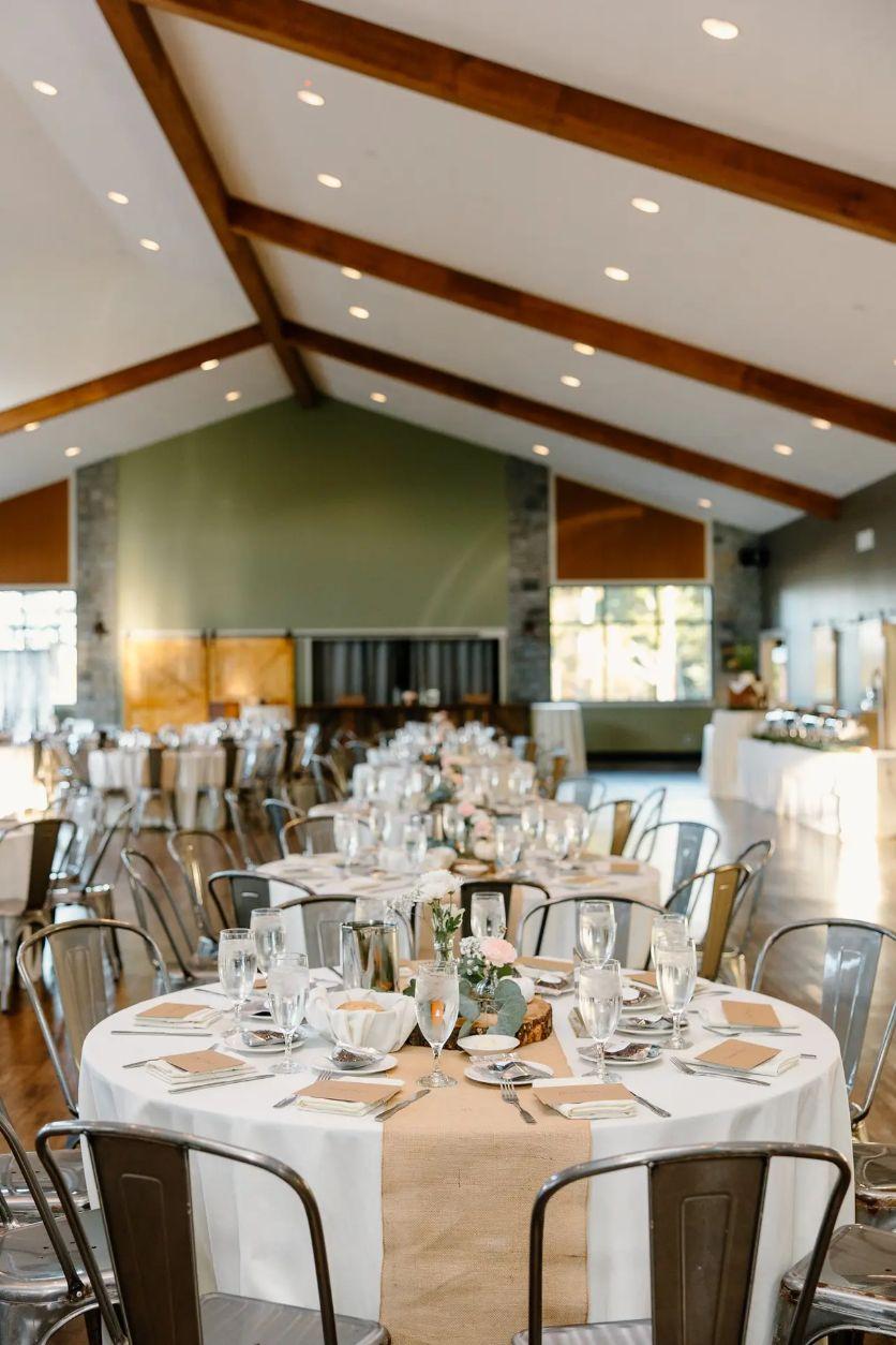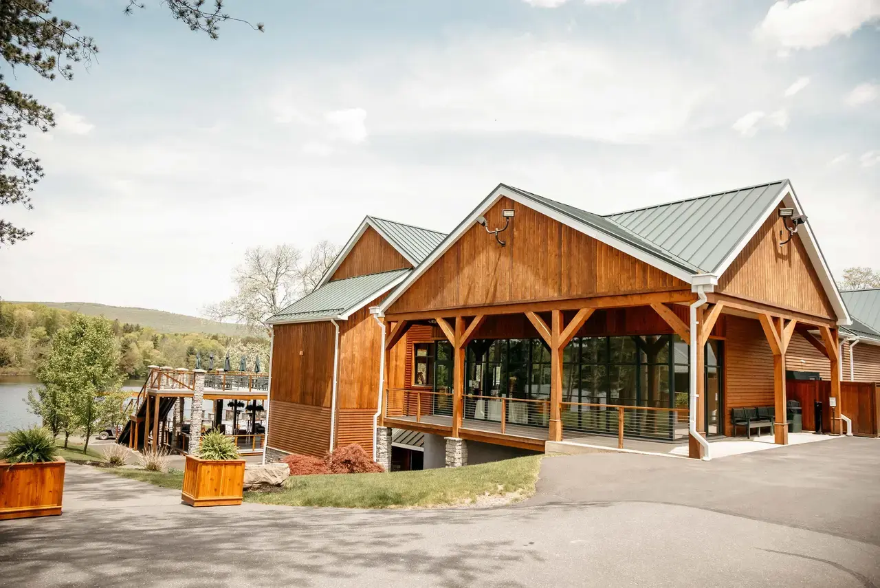 The Lake View Center is the venue’s premier reception space, blending rustic charm with modern sophistication. This expansive facility features exposed stone columns, warm wooden floors, and floor-to-ceiling windows that invite the beauty of the Poconos indoors. Guests can transition effortlessly to the attached expansive deck for fresh mountain air and sunset vistas over the water. Inside, the open layout provides a versatile canvas for dinner and dancing, ensuring a lively celebration atmosphere while keeping the stunning 100-acre lake as your constant backdrop.