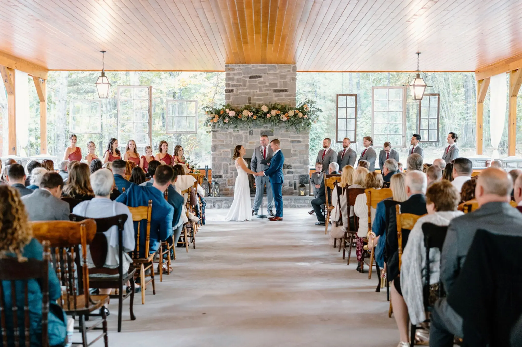 Tucked away in a grove of towering trees, the Woodland Pavilion offers a secluded, forest-inspired setting for your ceremony or rehearsal. This covered timber-frame structure features soaring wood-beam ceilings and a magnificent floor-to-ceiling stone fireplace that serves as a cozy focal point. Adorned with vintage wooden chairs, antique windows, and classic black chandeliers, the pavilion provides an intimate, "enchanted forest" aesthetic. It offers the perfect outdoor feel with the peace of mind of overhead cover, ensuring your celebration remains beautiful regardless of the weather.