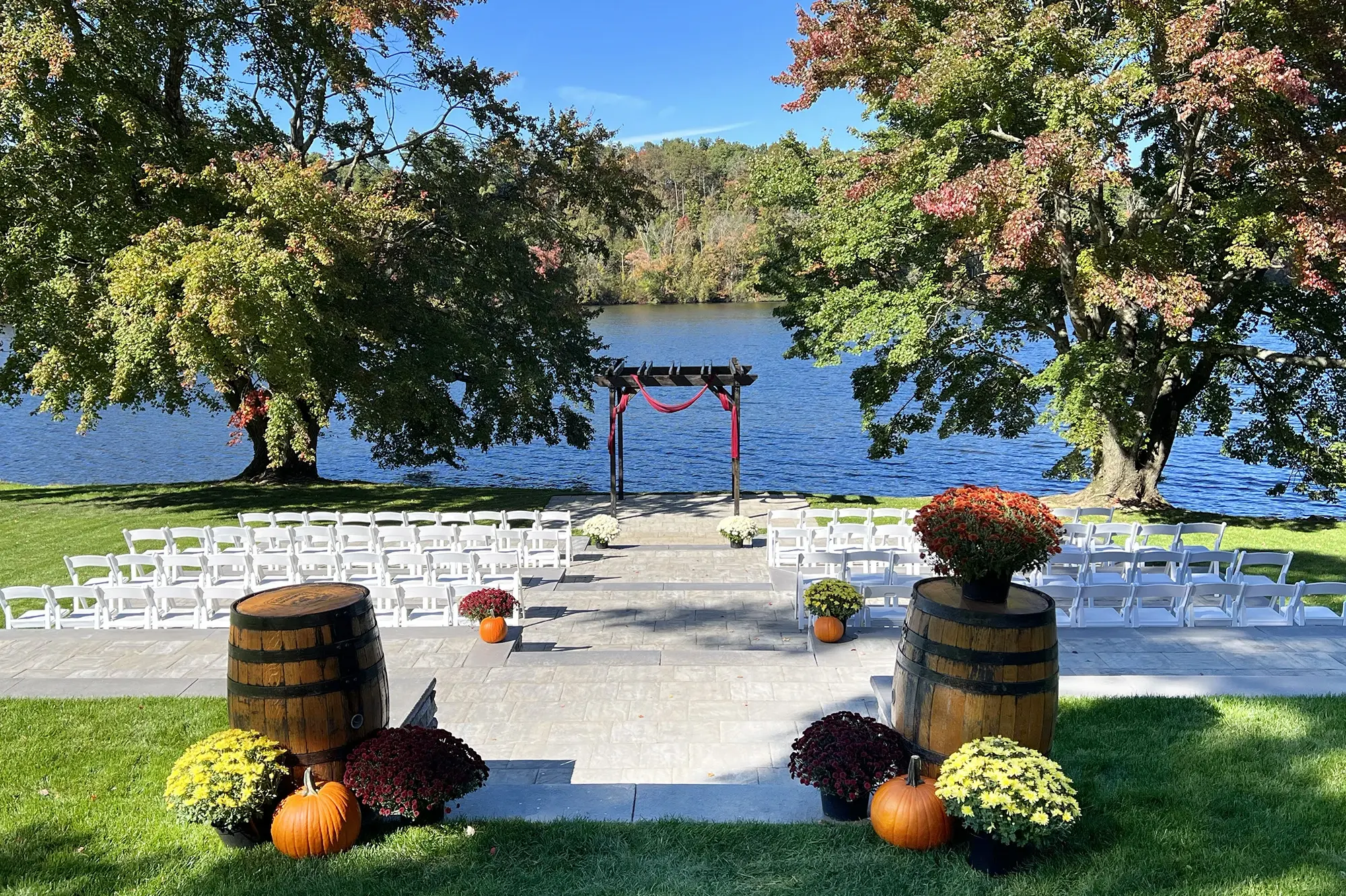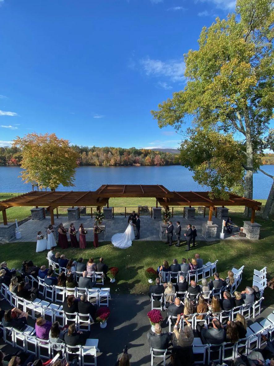 The Terraces feature a stunning, multi-tiered stone design carved into a gently sloping hillside overlooking the lake. This ceremony site creates a natural amphitheater effect, ensuring every guest has an unobstructed view of the waterfront as you stand beneath a rustic wooden arbor. Framed by stately maple trees—which offer a vibrant canopy of color during the autumn months—the space feels both grand and grounded. A central stone staircase provides a dramatic aisle for a grand entrance that leads directly toward the sparkling water’s edge.