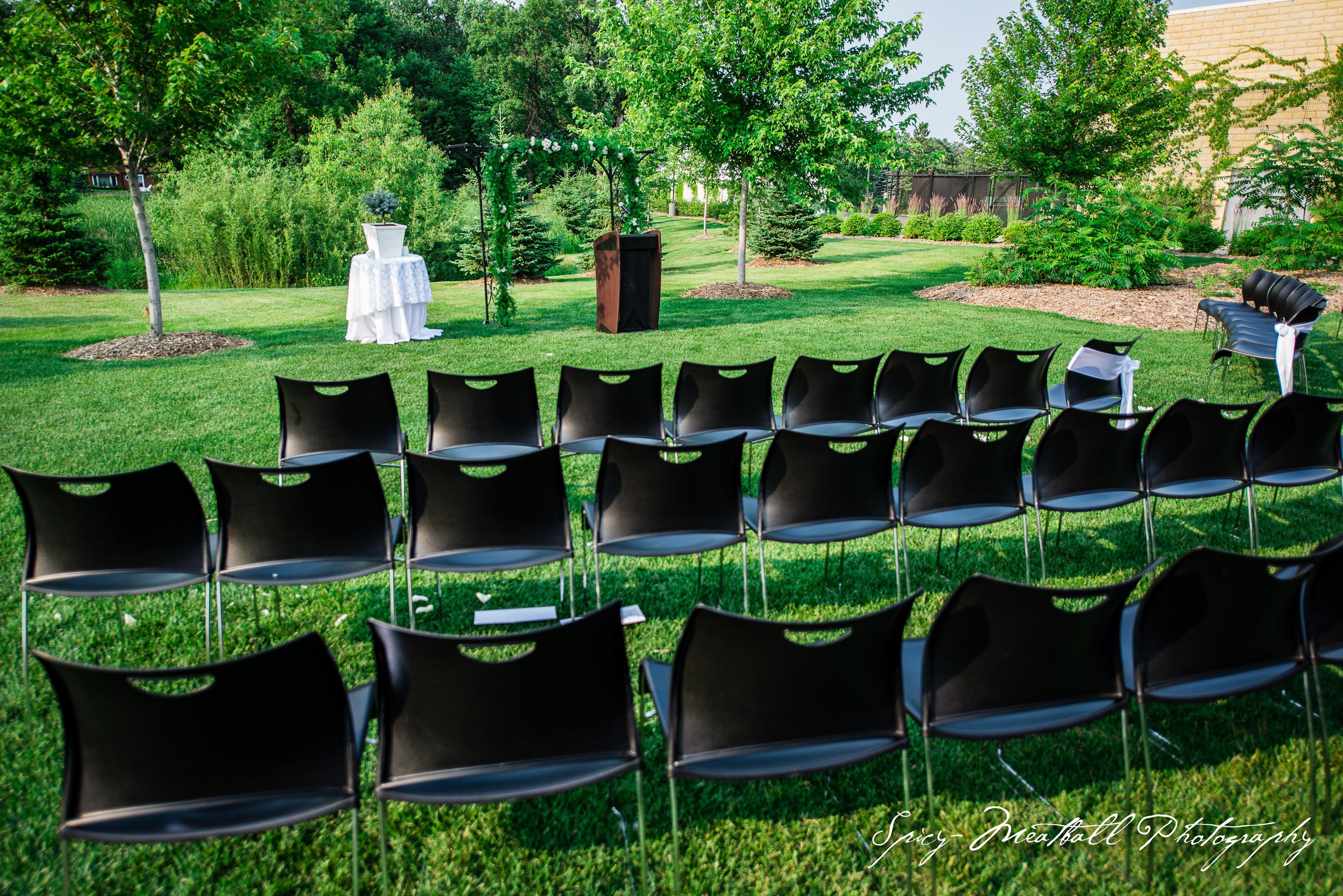 Celebrate your love surrounded by the vibrant serenity of our manicured lawn and mature shade trees. This expansive outdoor patio area offers a seamless blend of modern architecture and natural beauty, featuring a backdrop of warm brickwork and floor-to-ceiling windows that reflect the sprawling greenery. Dappled sunlight filters through the leaves, creating a romantic, airy ambiance perfect for a picturesque ceremony or an elegant cocktail hour.