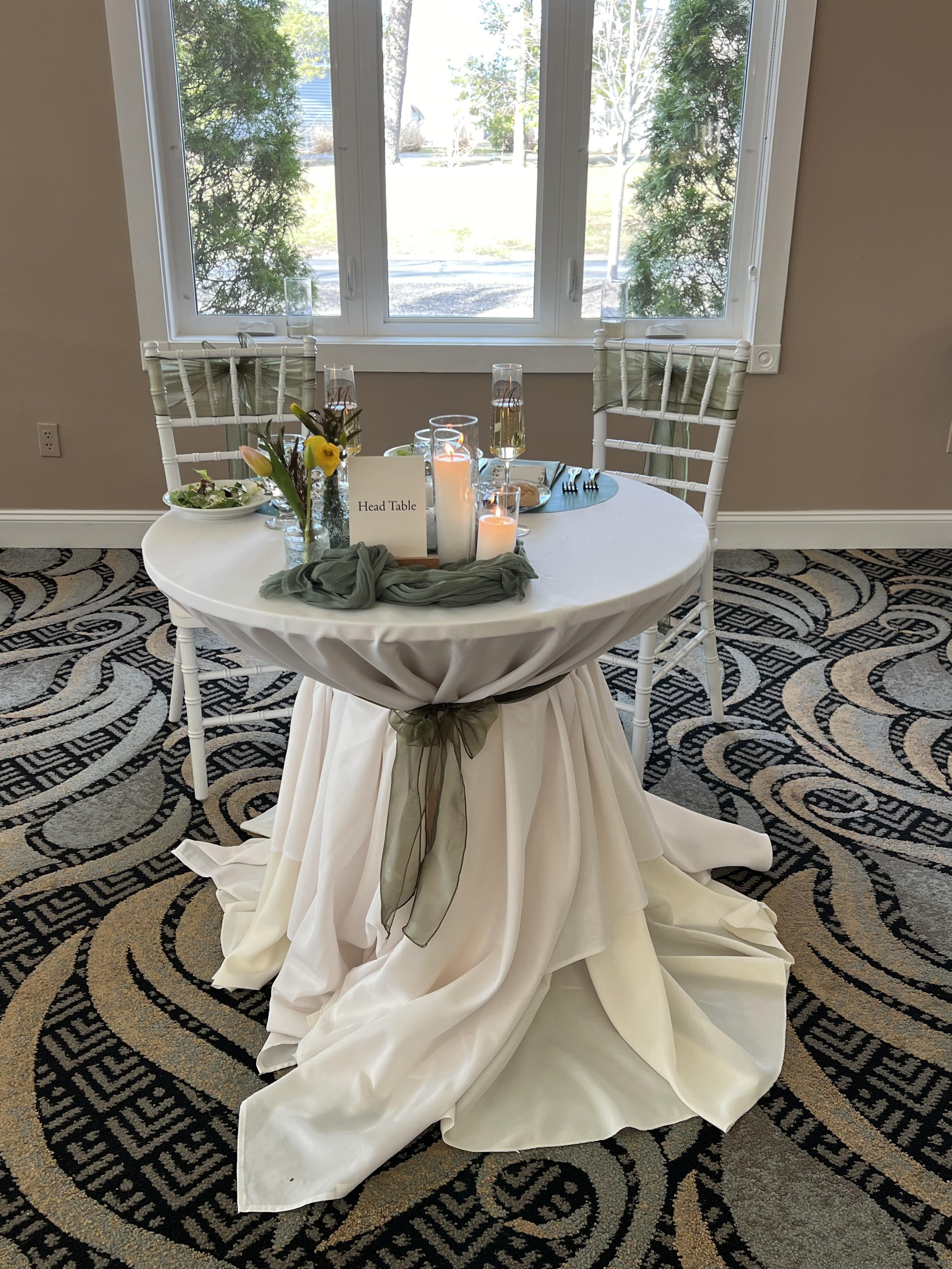 60" Round Tables White Chiavari Chairs Linens in White, Ivory or Black