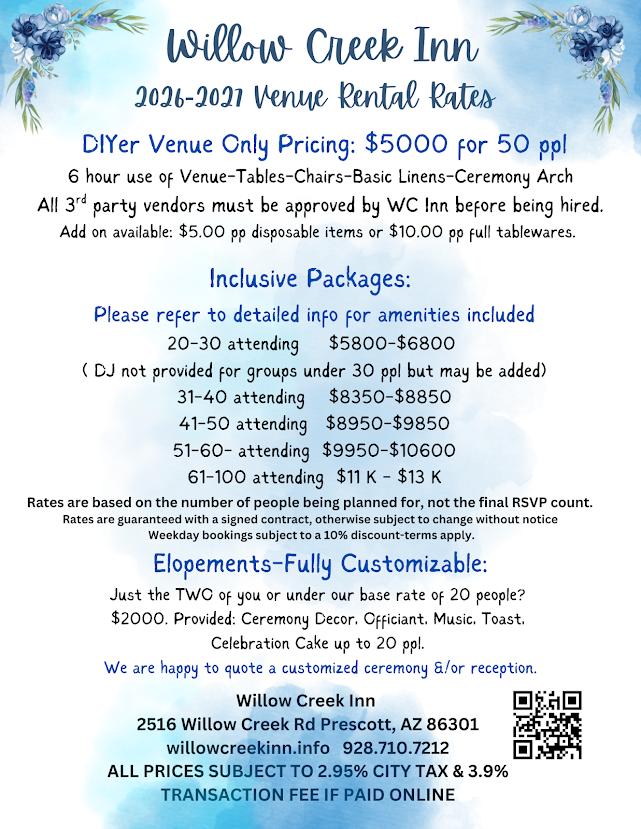 Historically charming in beautiful Prescott, Arizona, our boutique venue is a decoration backdrop on its own. We specialize in a very affordable venue rate that includes amenities such as tables, chairs, linens, table settings, glassware, catering serving pieces, outdoor heaters, & sun umbrellas. We have a very generous inventory of decor items that you may use...all included in the venue rental rate. This leaves you with a budget to spend on other important aspects of your special day. We can do an all-inclusive quote for your OR leave the vendor selection up to you! Either way, our staff at the Willow Creek Inn will assist you in making your every dream come true. Also, we can host all sorts of gatherings and parties for your closest family and friends, such as Anniversary, Engagement, Celebration of Life, and Birthdays, simply inquire for those rates outside of full wedding services. All our best, Nancy Bewley Innkeeper and Venue Owner