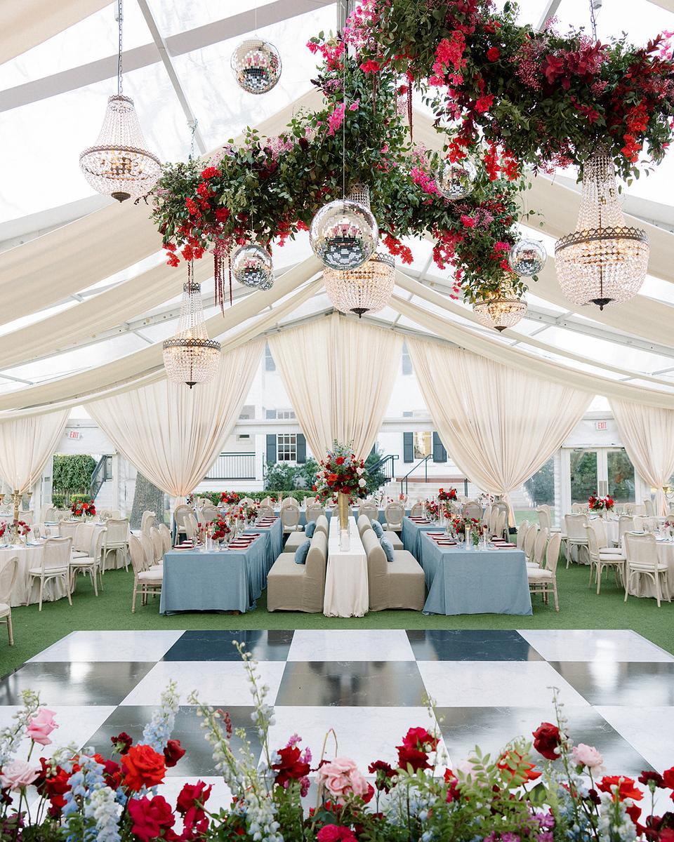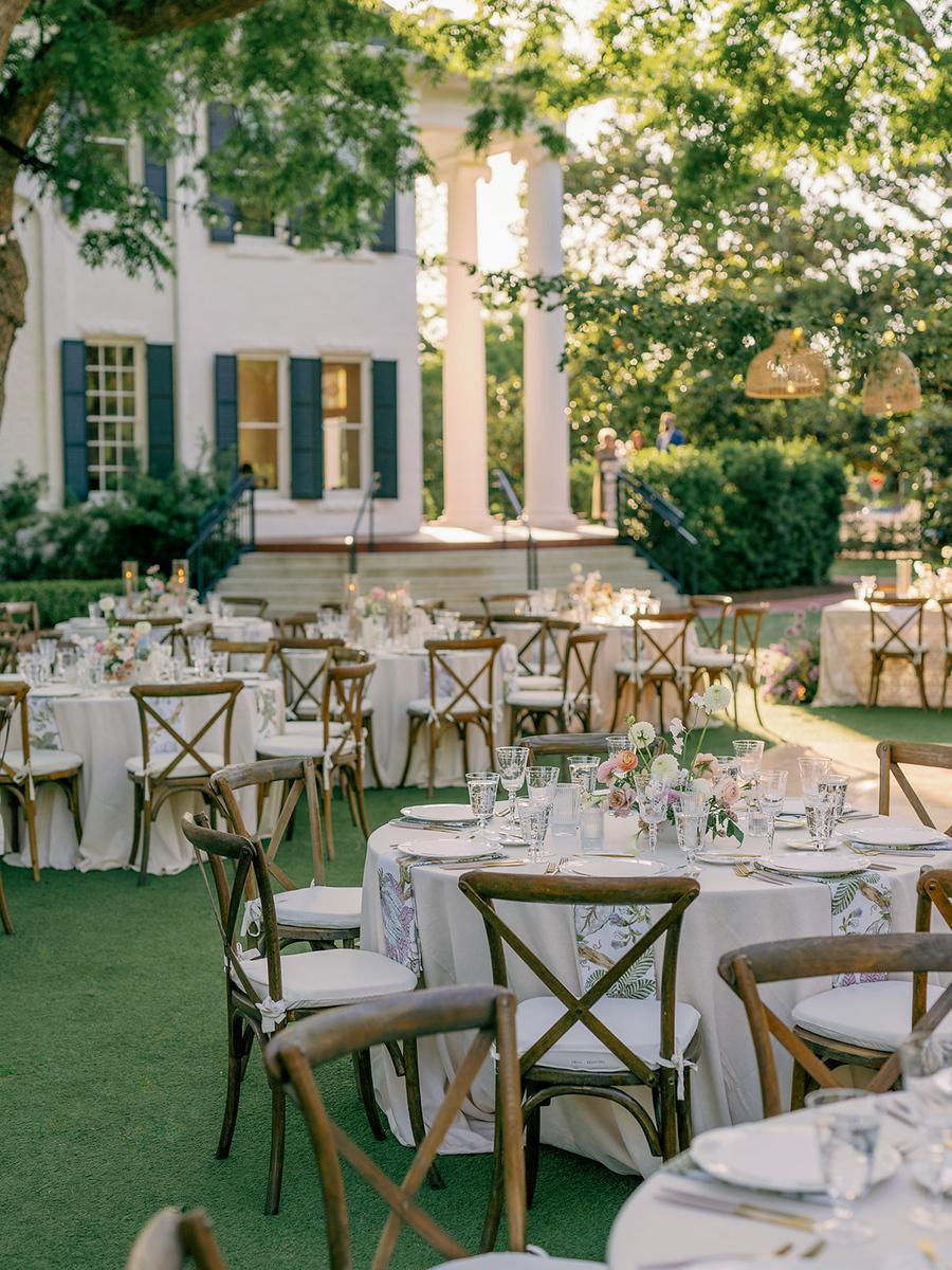 The east side of the mansion features an expansive turf lawn surrounded by majestic shade trees. There are three ceremony locations to choose from such as the charming gazebo, the elegant portico staircase, or in front of the towering magnolia tree. With plenty of room to spread out, this space is perfect for an al fresco reception or dinner and dancing under the glowing lights of our beautiful tent.