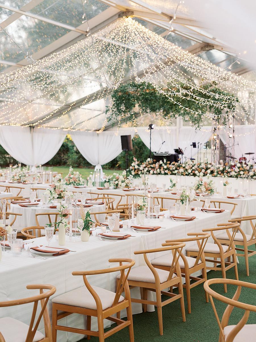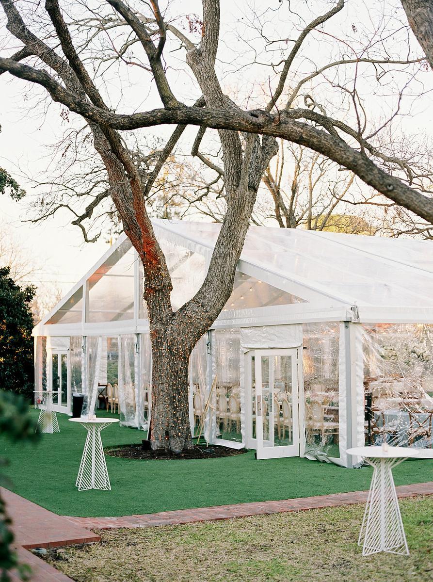 Our 60’ x 66’ clear-top, fully enclosed winter tent is included in the venue rental for events held December through February, complete with installed lighting. It accommodates up to 250 guests, depending on layout. The tent can be heated and features two sets of French doors and clear walls that can be easily opened and tied back for an open-air feel on milder Texas winter days.
